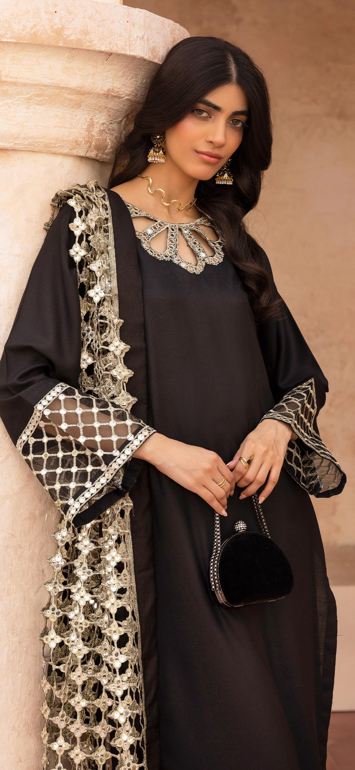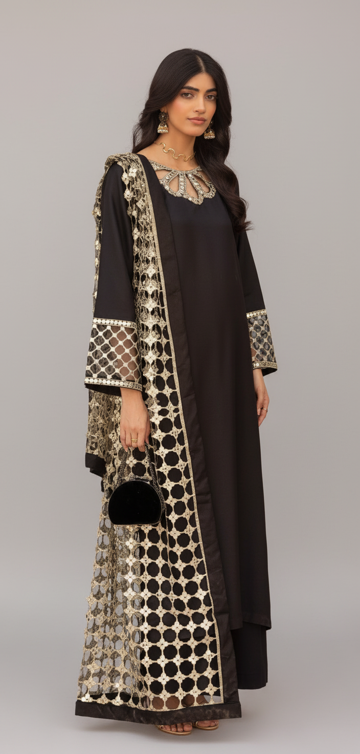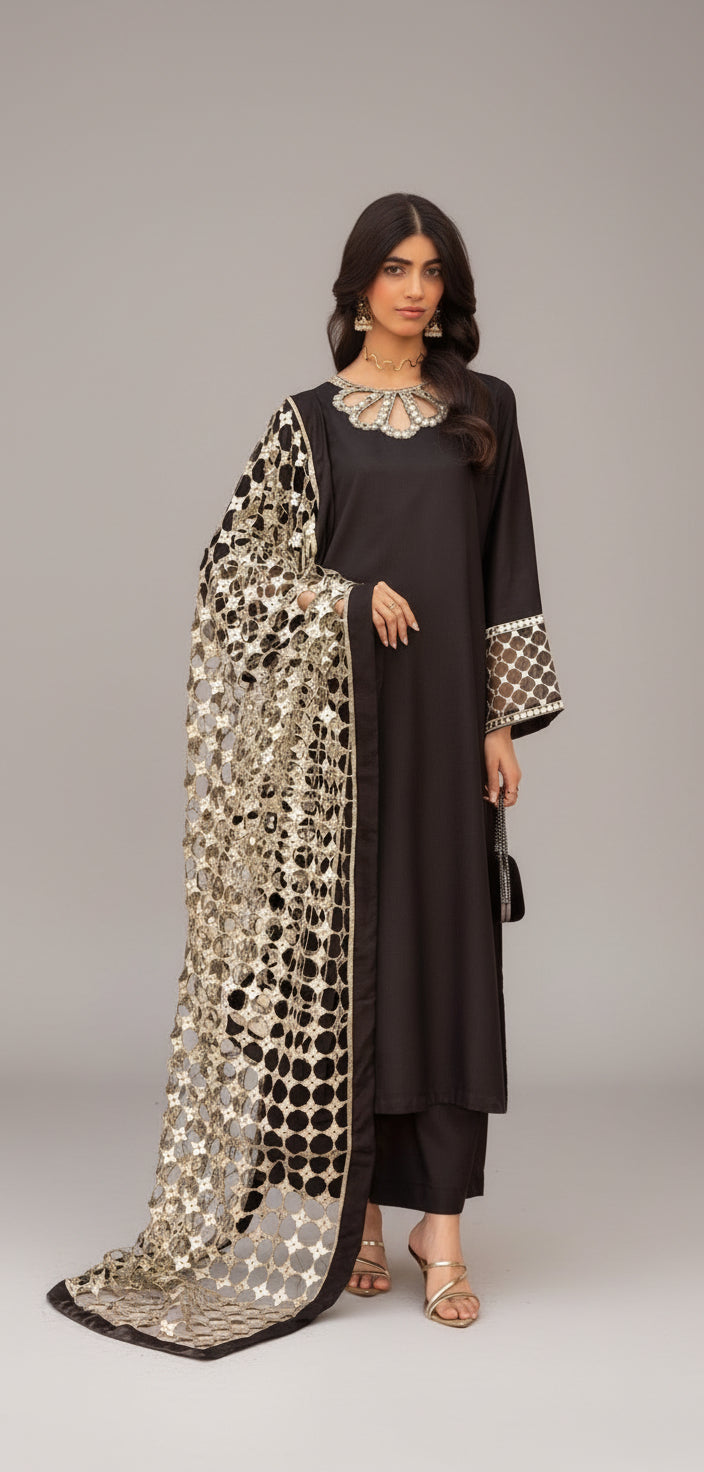 Black 3pc Suit with Cutwork Neckline & Dupatta