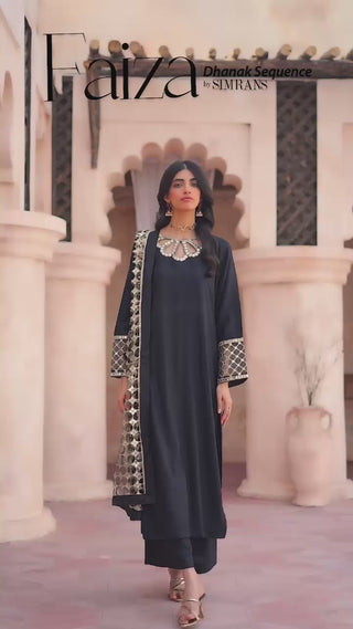 A Elegant Winter Dhanak suit with a statement detailing the neckline and sleeves with a Cutwork Shawl