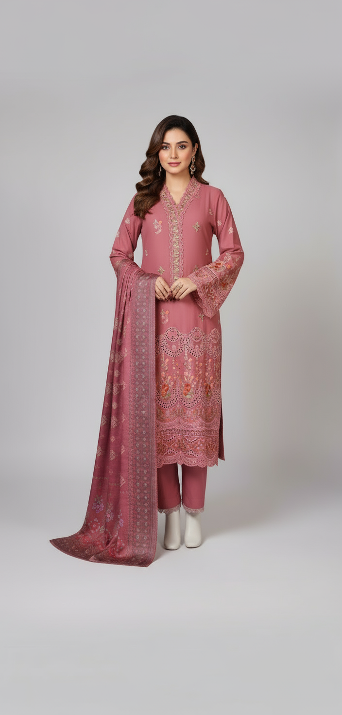 • Winter Linen suit with heavy embroidery and lace patchwork on the hem and sleeves and a printed Shawl