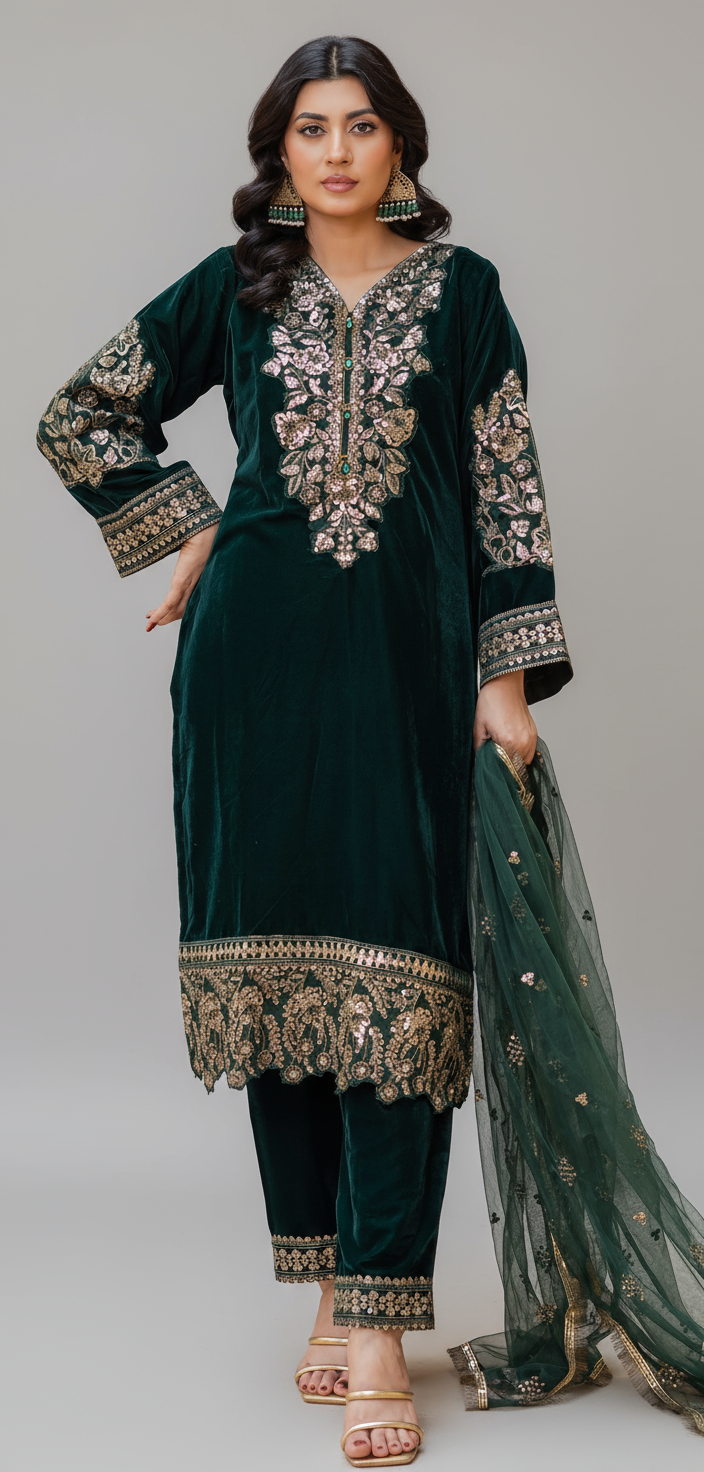 • Made of luxurious Velvet fabric. It features beautiful sequence embroidery on the neck, arms, and daman. The arms and daman also have fancy velvet patches that make it look even more beautiful.