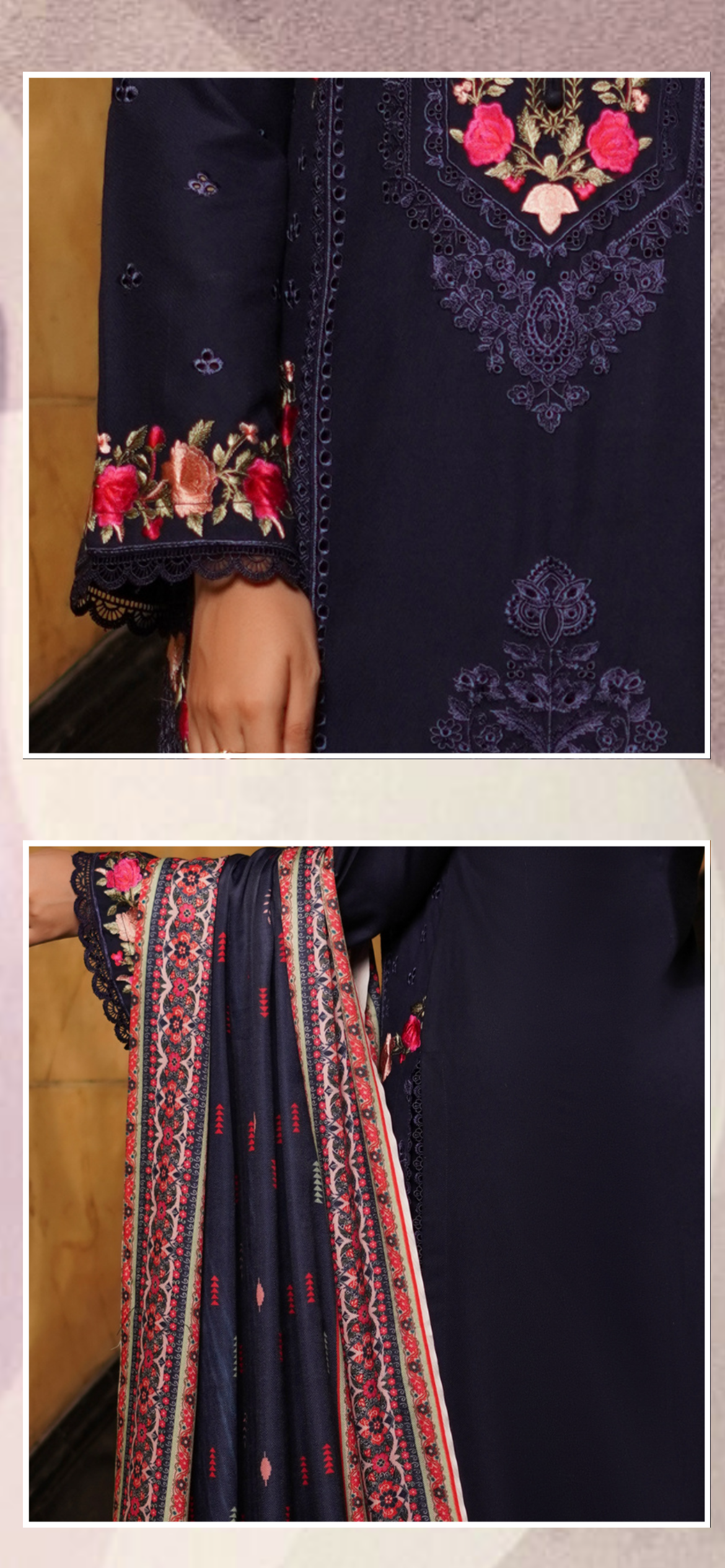 • Winter Linen suit with heavy embroidery and lace patchwork on the hem and sleeves and a printed Shawl