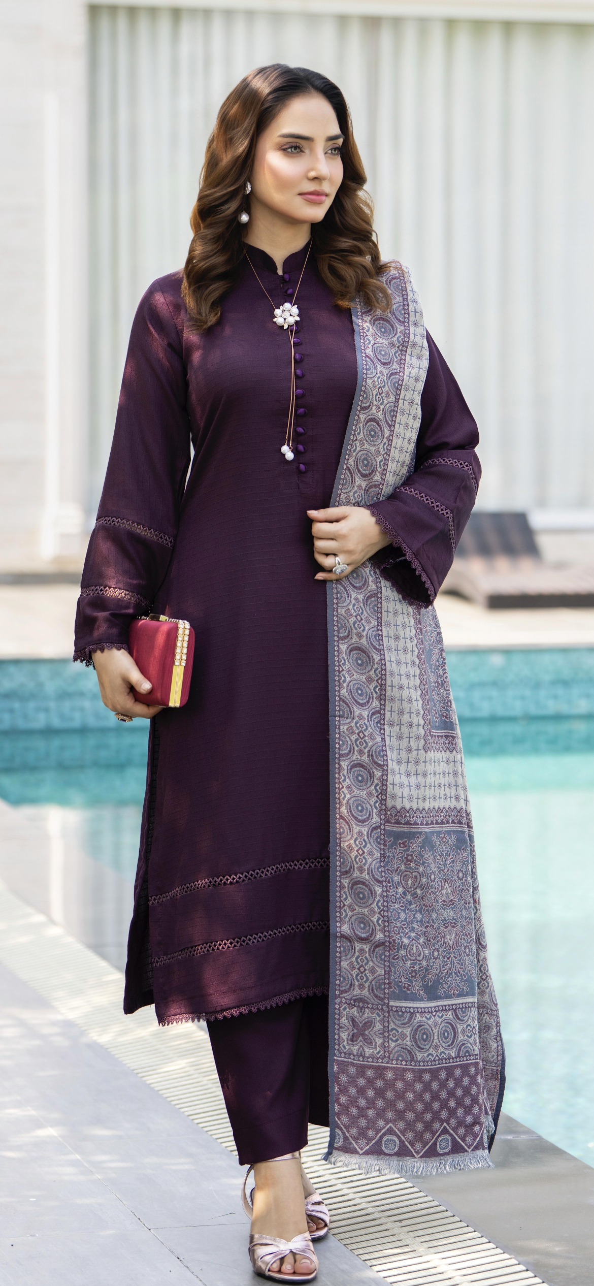 A lovely simple addition to your winter wardrobe with these winter Dhanak 3pc suit with Embroided Shawl. Long kameez with trousers to match.