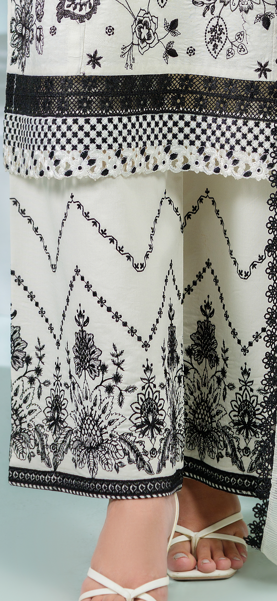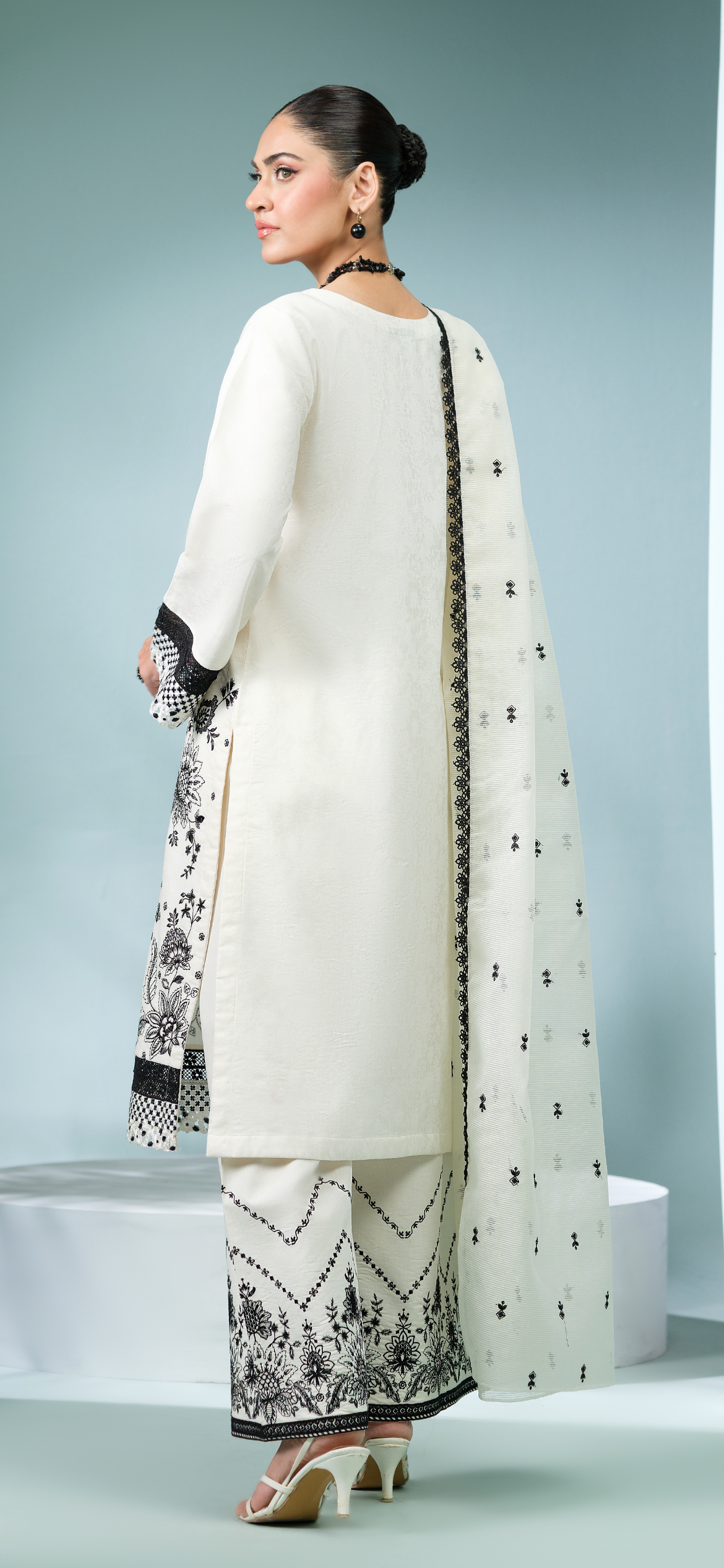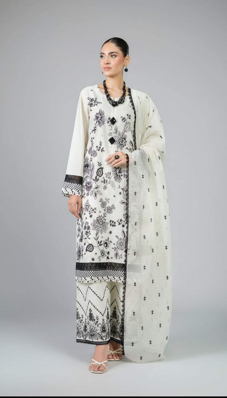 The dress comes with an Organza scarf, offering a rich and textured look. Its luxurious fabric and soft texture complement the embroidered details on the shirt and trousers, creating a harmonious overall ensemble.