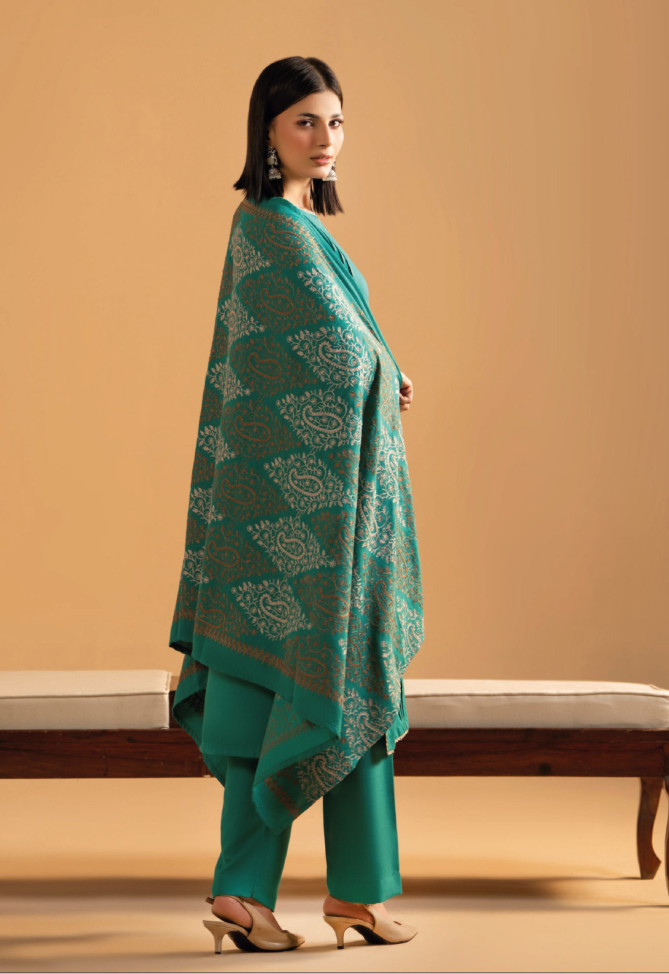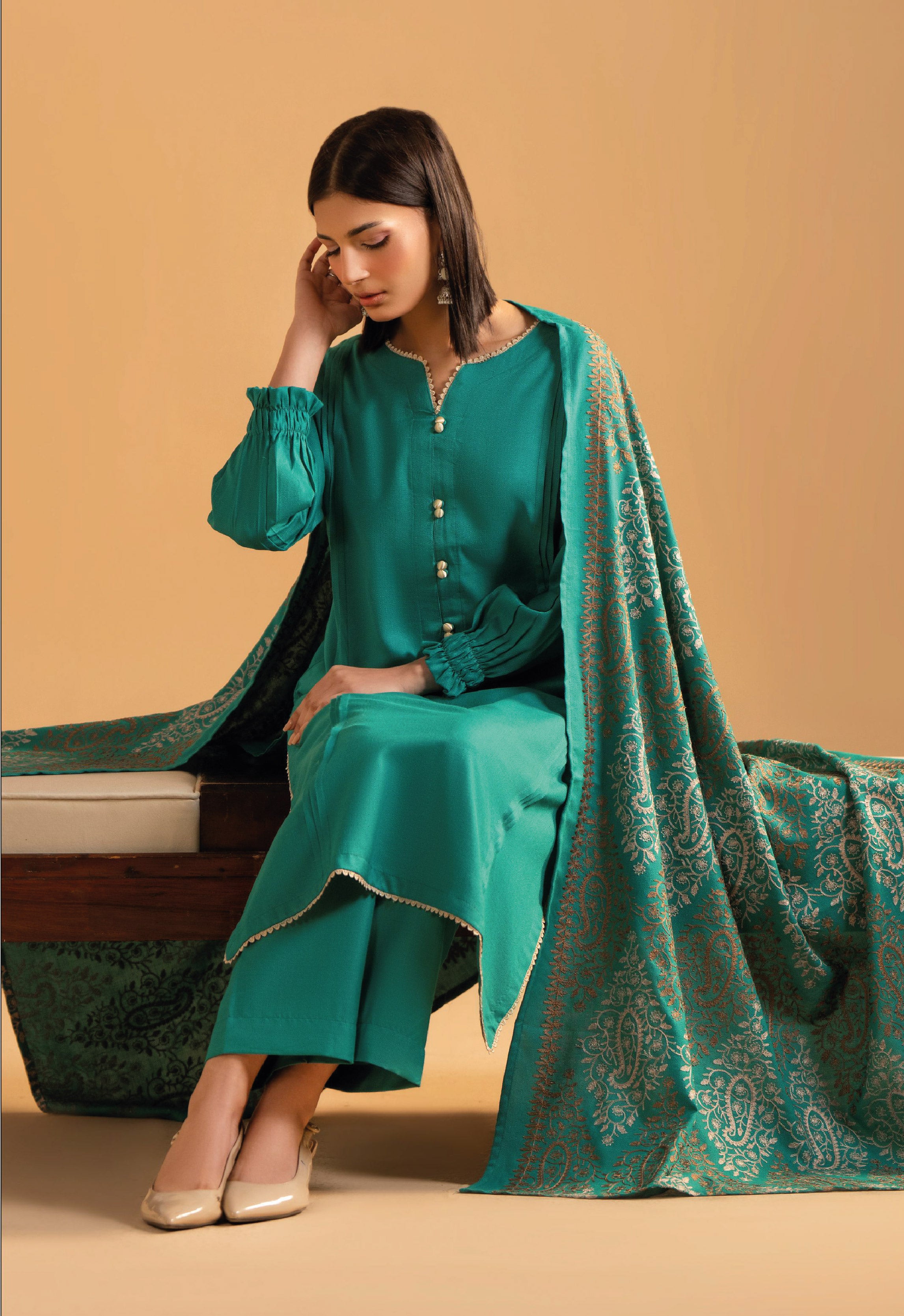 A lovely simple addition to your winter wardrobe with these winter linen 3pc suits. Long kameez with trousers and a beautiful thread embroidered shawl