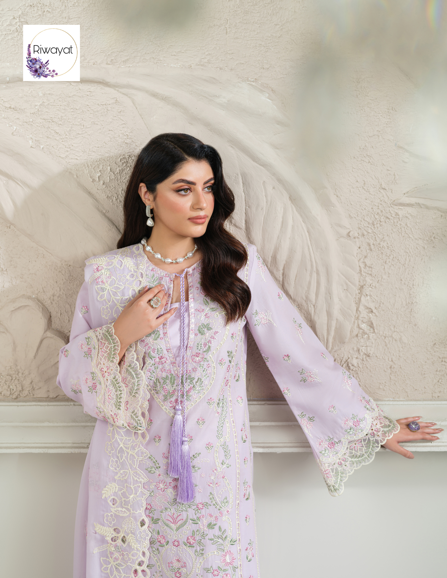 Made from Viscose fabric. It is beautifully fully embroidered, including on the sleeves, arms, and Daman. The arms and daman have a beautiful cutwork style, and there is also beautiful lacework on the daman.