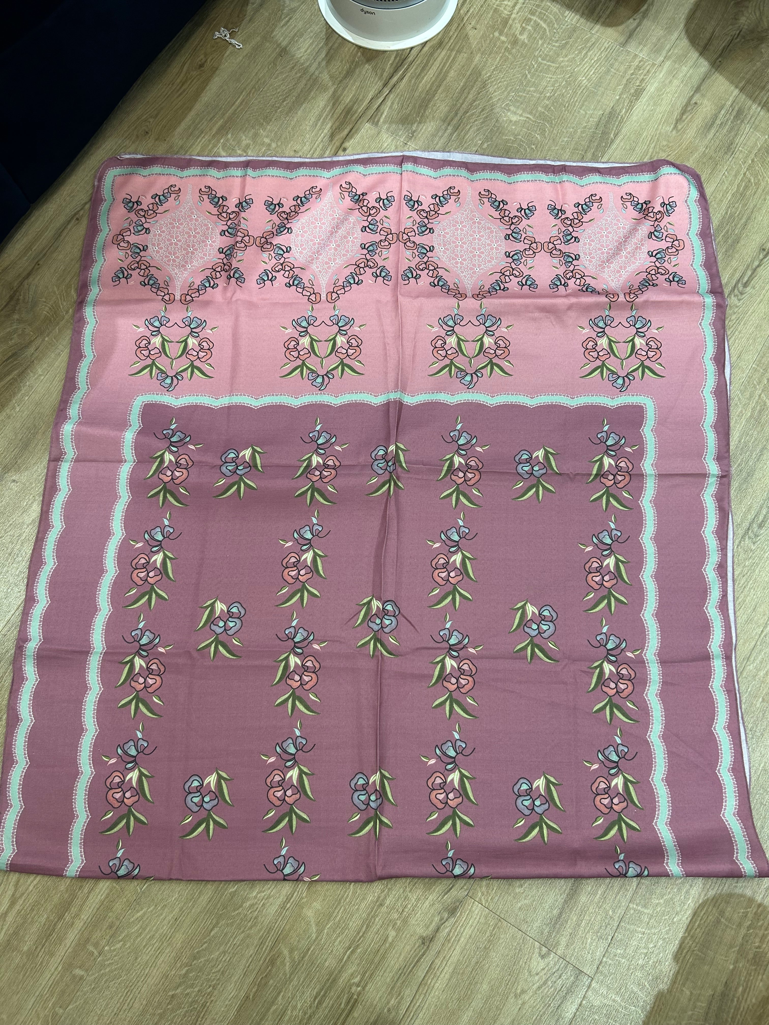 Dupatta (Winter Shawl): A printed winter shawl in coordinating shades of mauve and dusty rose, featuring a repeat floral motif and a contrasting mint-green scalloped border for a refined finish.