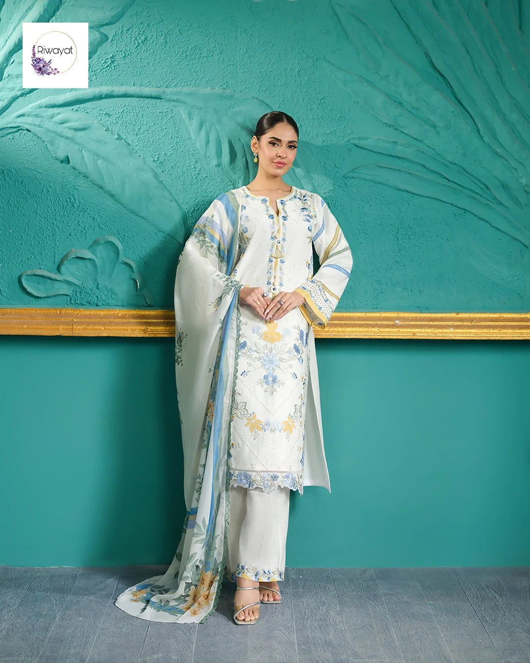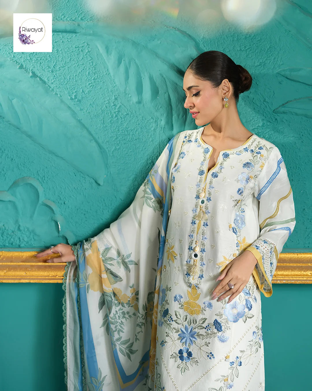 Shirt: Made from premium Lawn fabric. It features delicate embroidery in sky blue and mustard tones across the front and sleeves. The Daman and sleeve cuffs are finished with a sophisticated cutwork style and intricate embellishments.