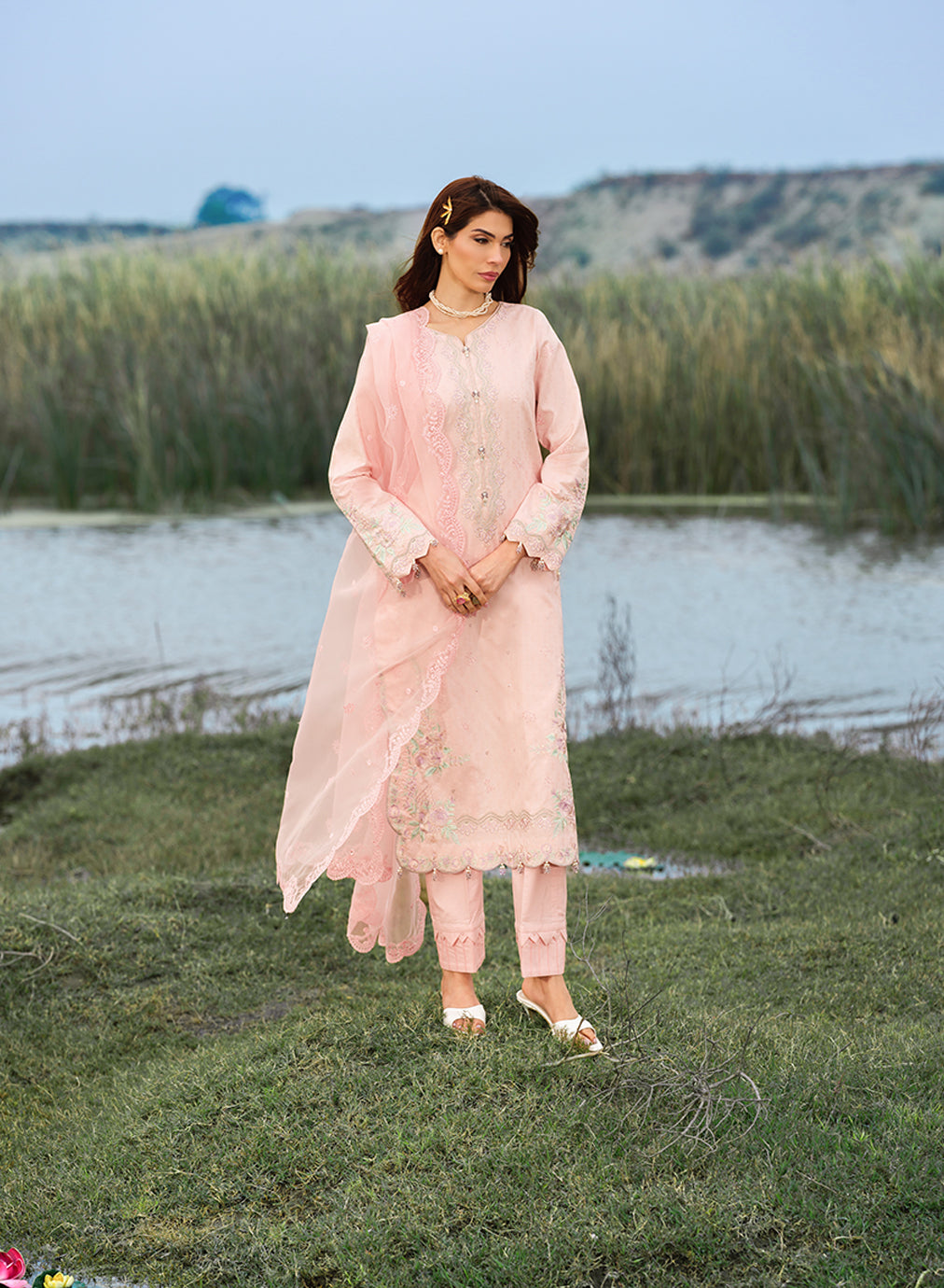 Dupatta: Matching organza dupatta, also adorned with intricate sequin embroidery and elegant scalloped borders.