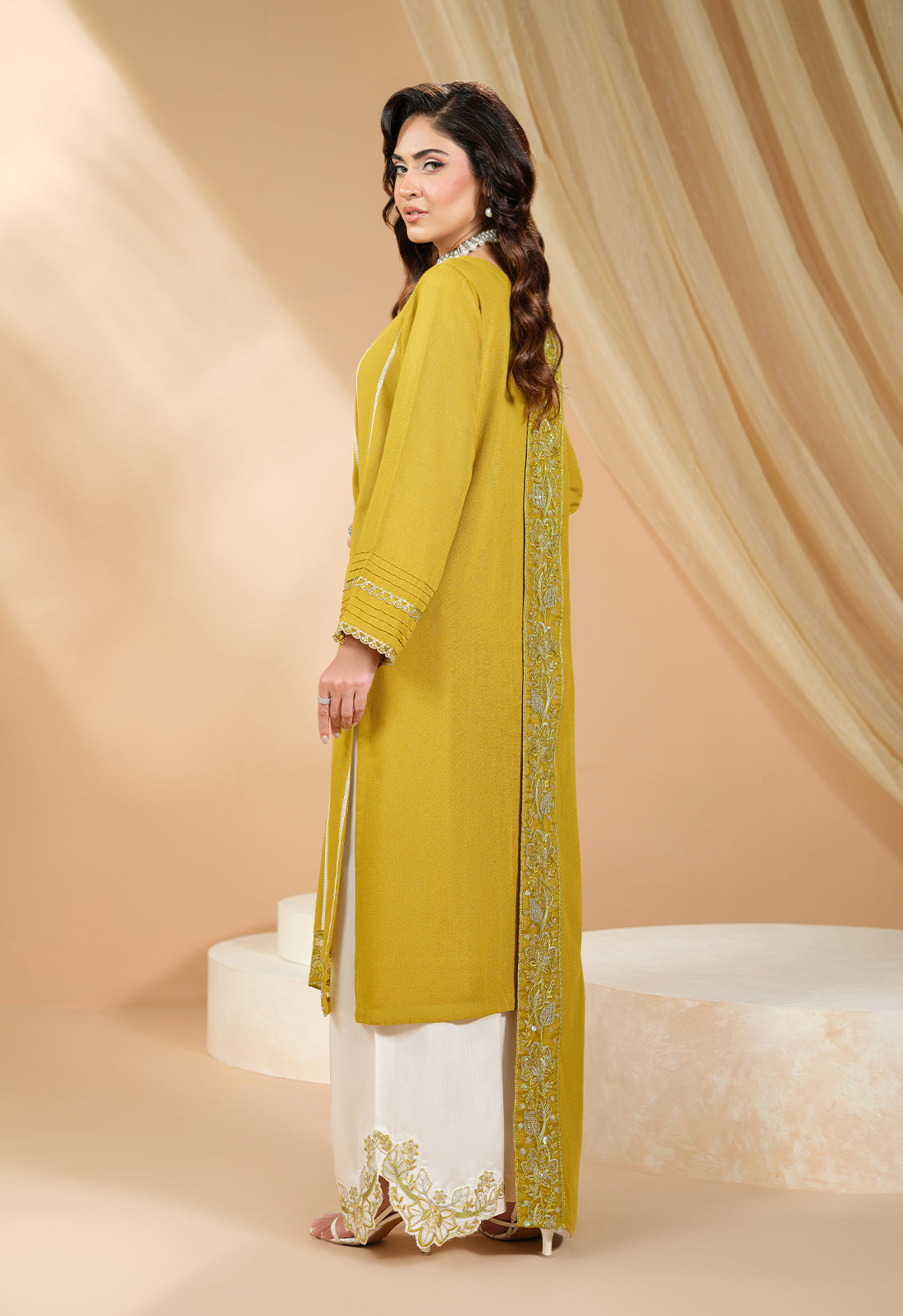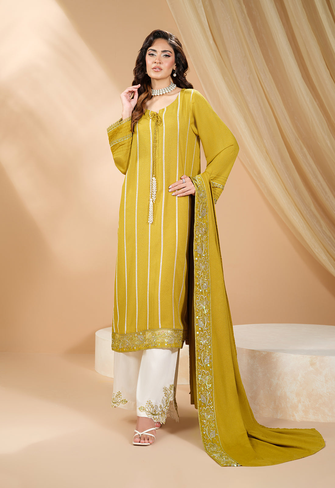 The dress comes with an Organza scarf, offering a rich and textured look. Its luxurious fabric and soft texture complement the embroidered details on the shirt and trousers, creating a harmonious overall ensemble.