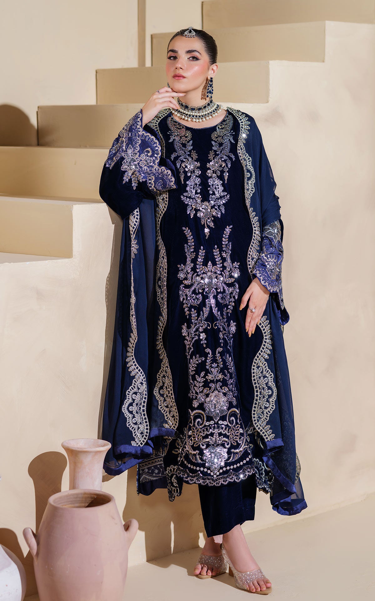 Shirt: A navy blue velvet kurta with a round neckline, featuring intricate silver tilla and sequin embroidery down the center, a floral hem border, and matching sleeve cuff details.