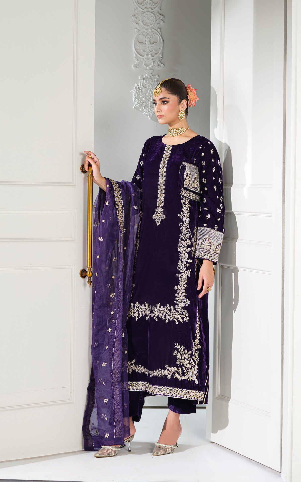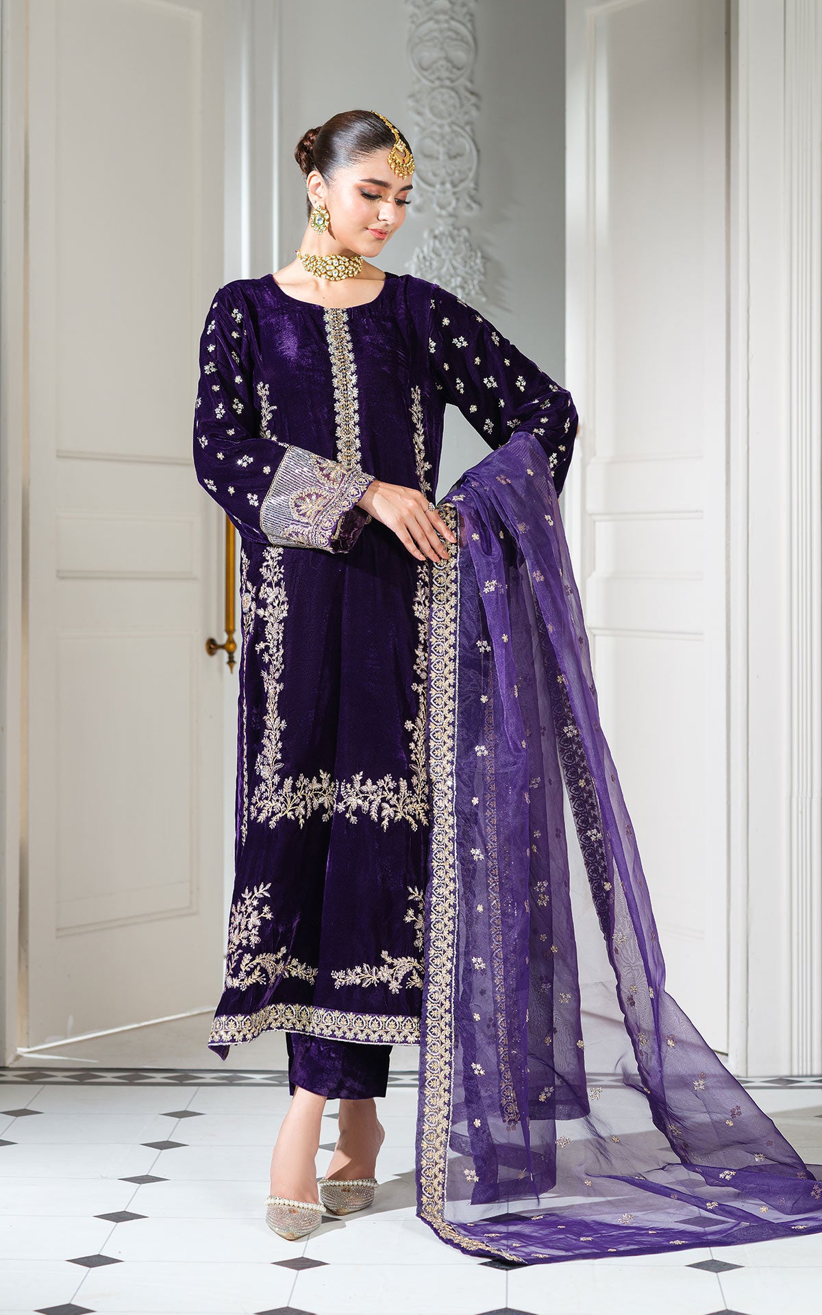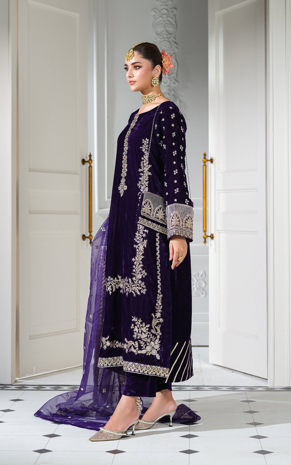 Dupatta: A sheer purple net or organza dupatta with a broad gold-embroidered border and scattered gold motifs.