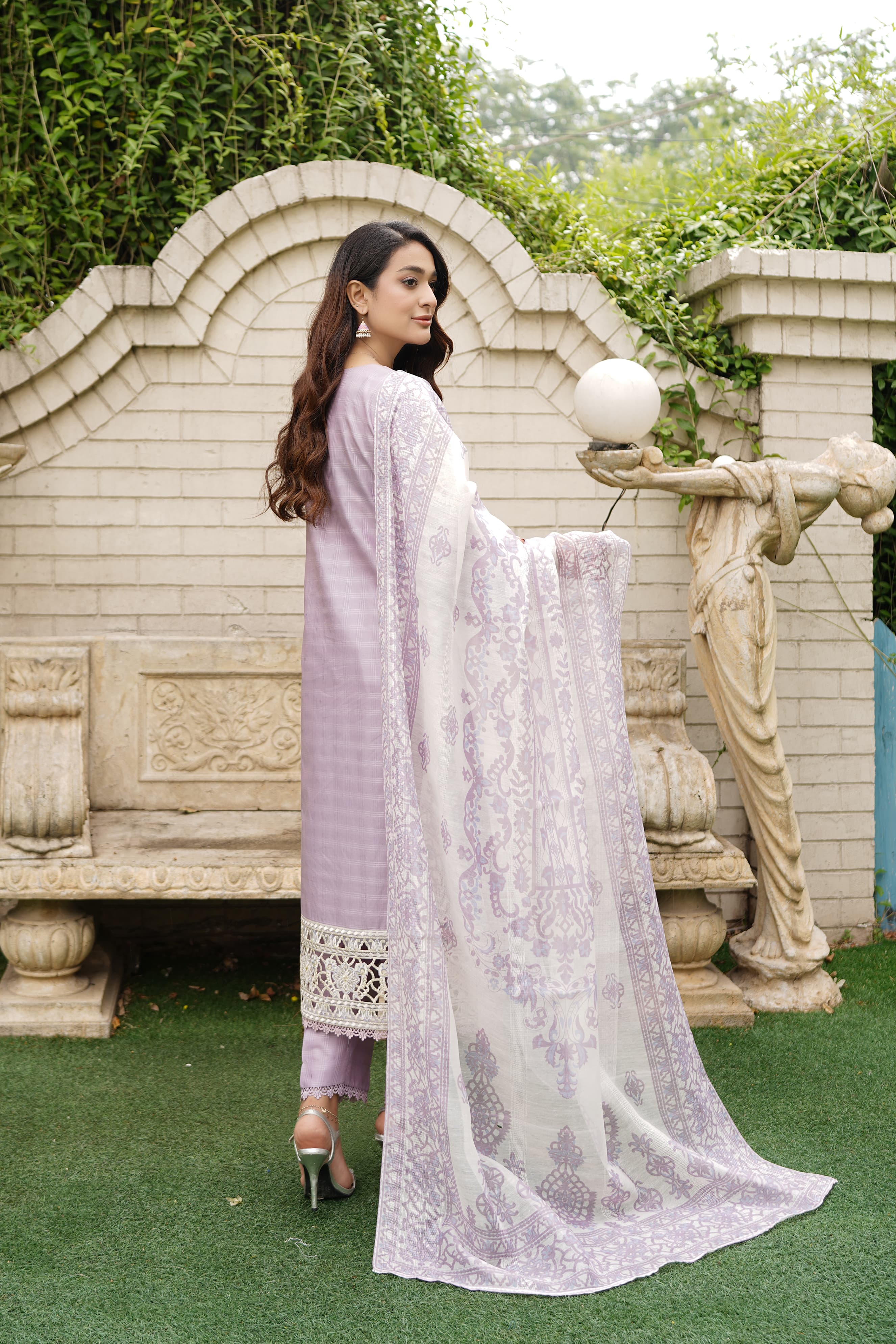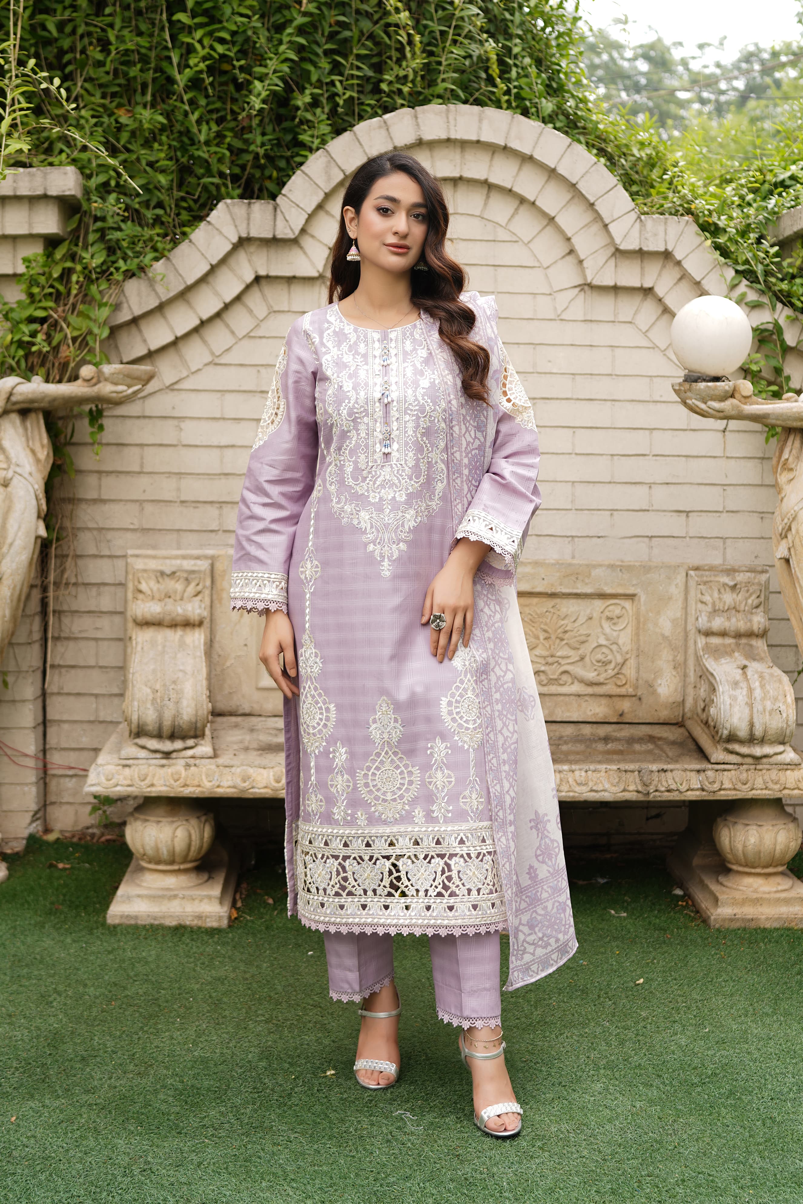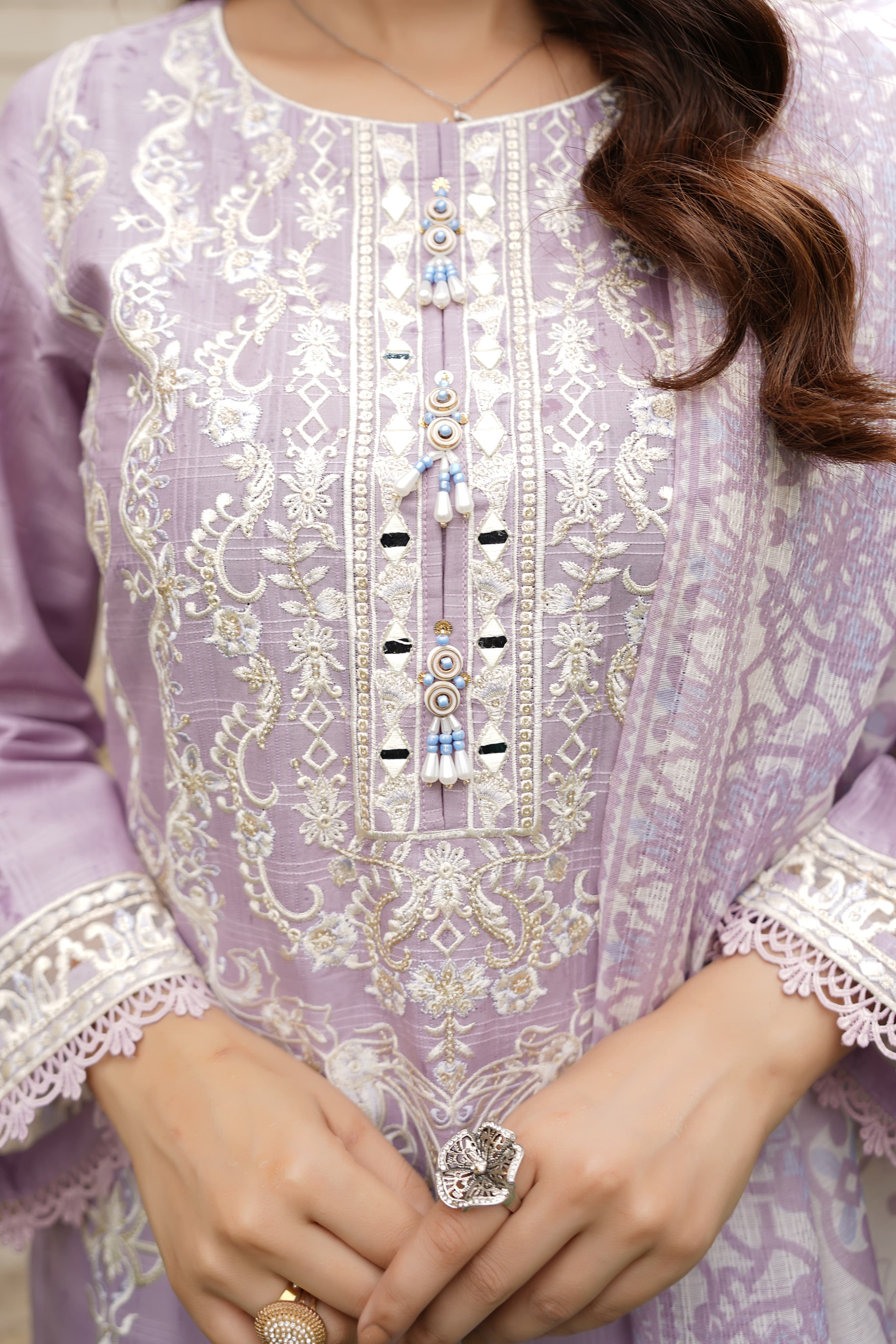 Thread embroidery on the kameez and sleeves with contrasting printed dupatta