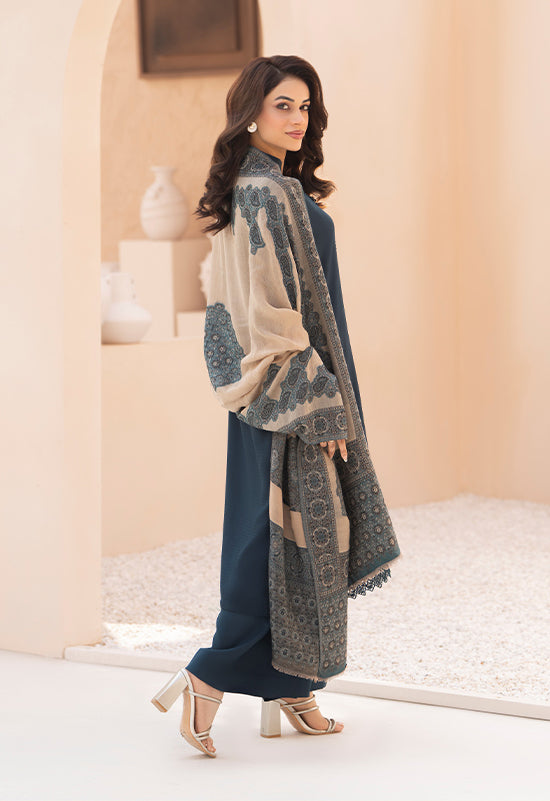 A lovely simple addition to your winter wardrobe with these winter Dhanak 3pc suit with Embroided Shawl. Long kameez with trousers to match.