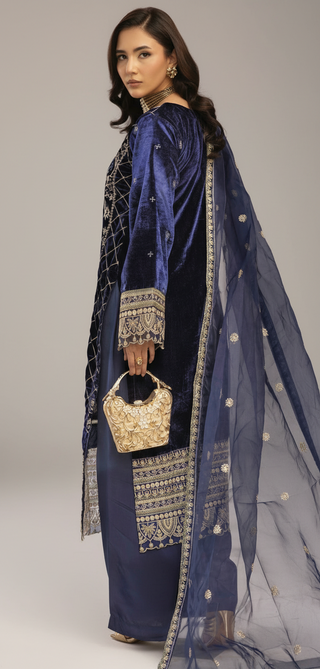 Navy 3pc Dhanak Suit with Velvet Shawl