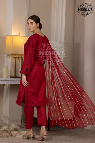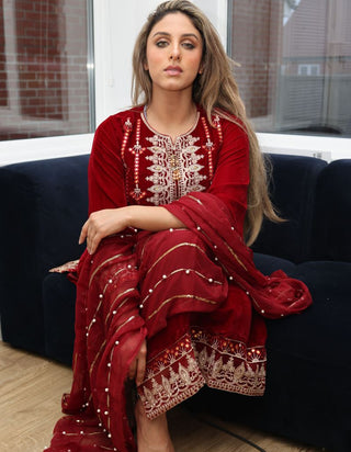 Red 3pc Velvet Suit with Chiffon Dupatta