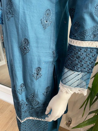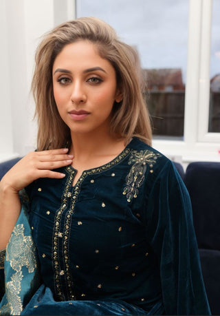 Teal 3pc Velvet Suit with Linen Jacquard Dupatta