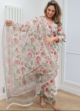 Cream Floral Printed 3pc Suit with Organza Dupatta