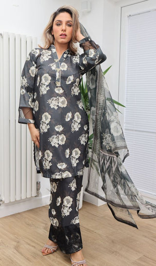 Charcoal Floral Printed 3pc Suit with Organza Dupatta
