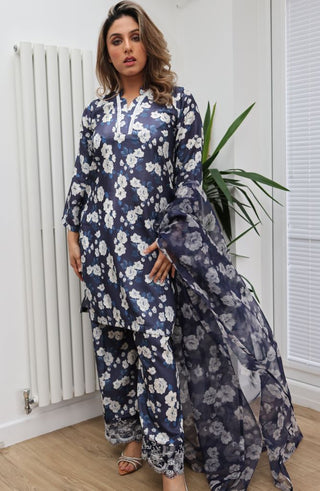 Navy Floral Printed 3pc Suit with Organza Dupatta