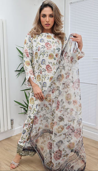 White Floral Printed 3pc Suit with Organza Dupatta