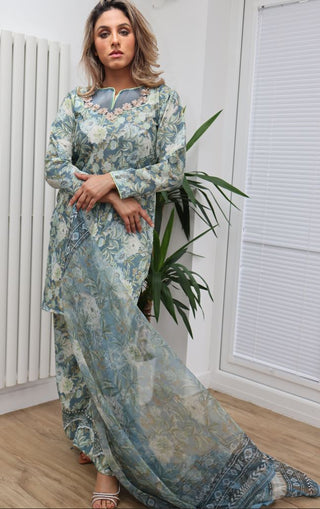 Sea Green Floral Printed 3pc Suit with Organza Dupatta