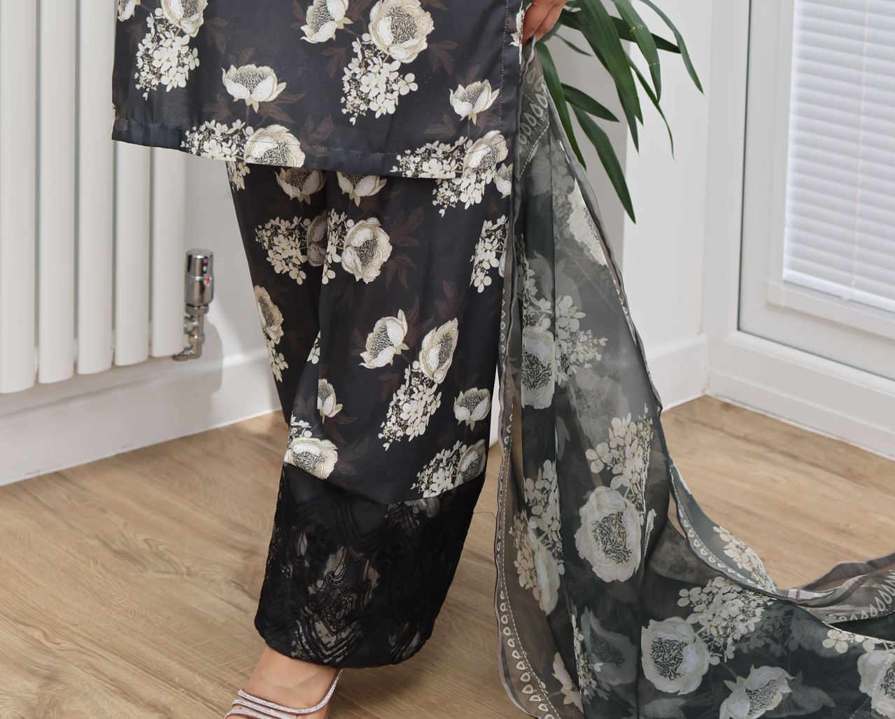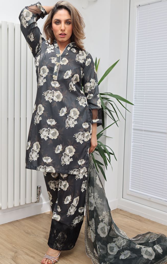 Charcoal Floral Printed 3pc Suit with Organza Dupatta