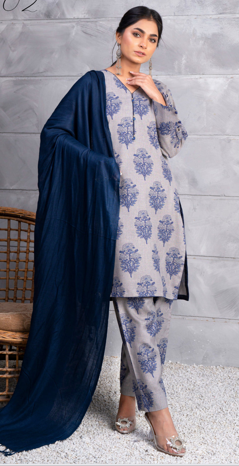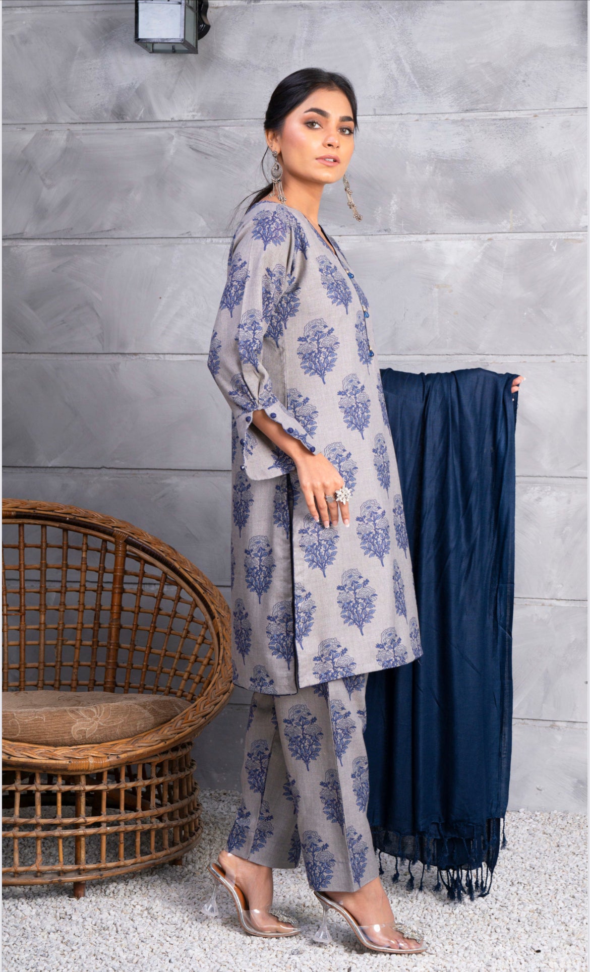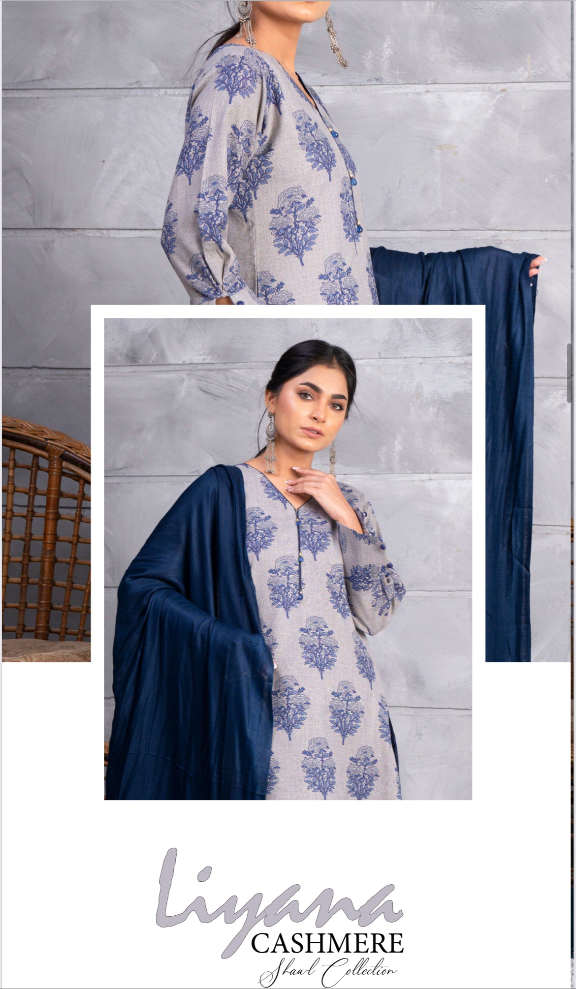 Linen floral print suit with matching salwar and Contrast Wool Shawl.
