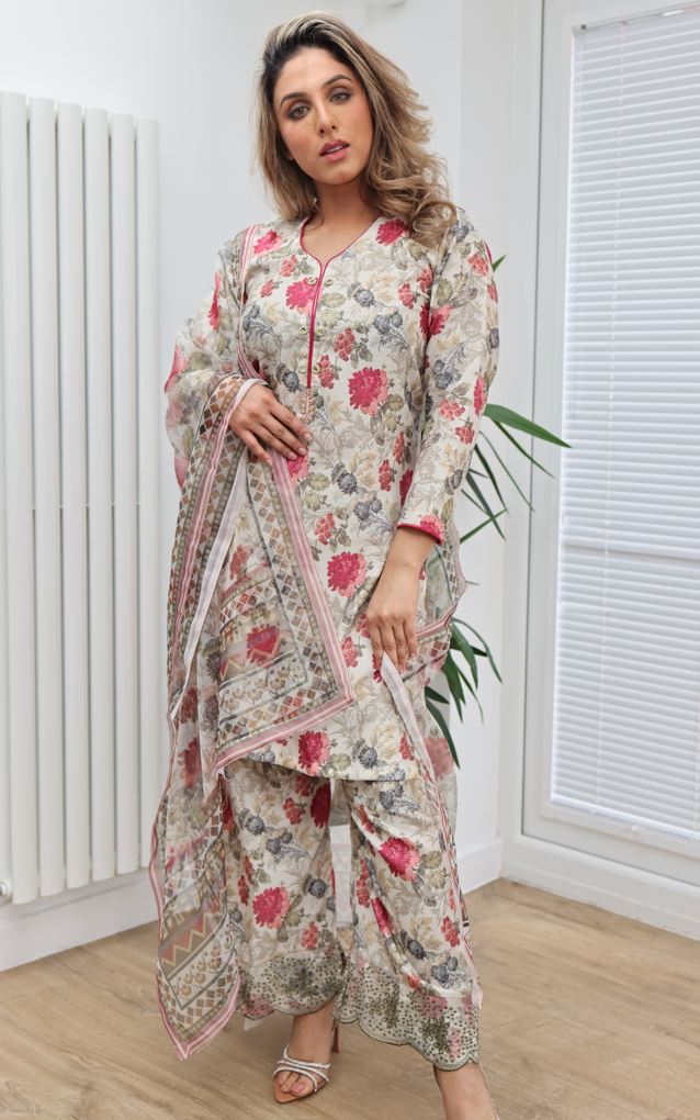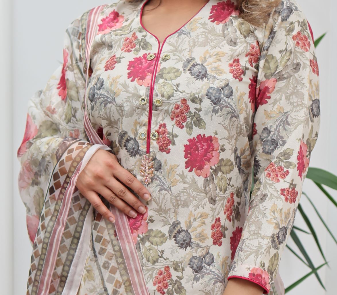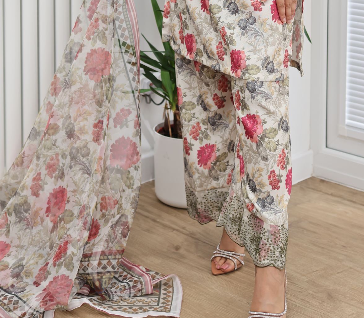 Digital Texture Print Lawn Kari Suit with lace detailing on the neckline and embroidered patchwork on the bottom of the trousers