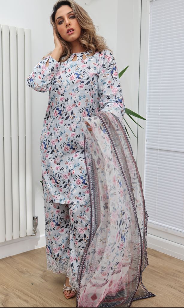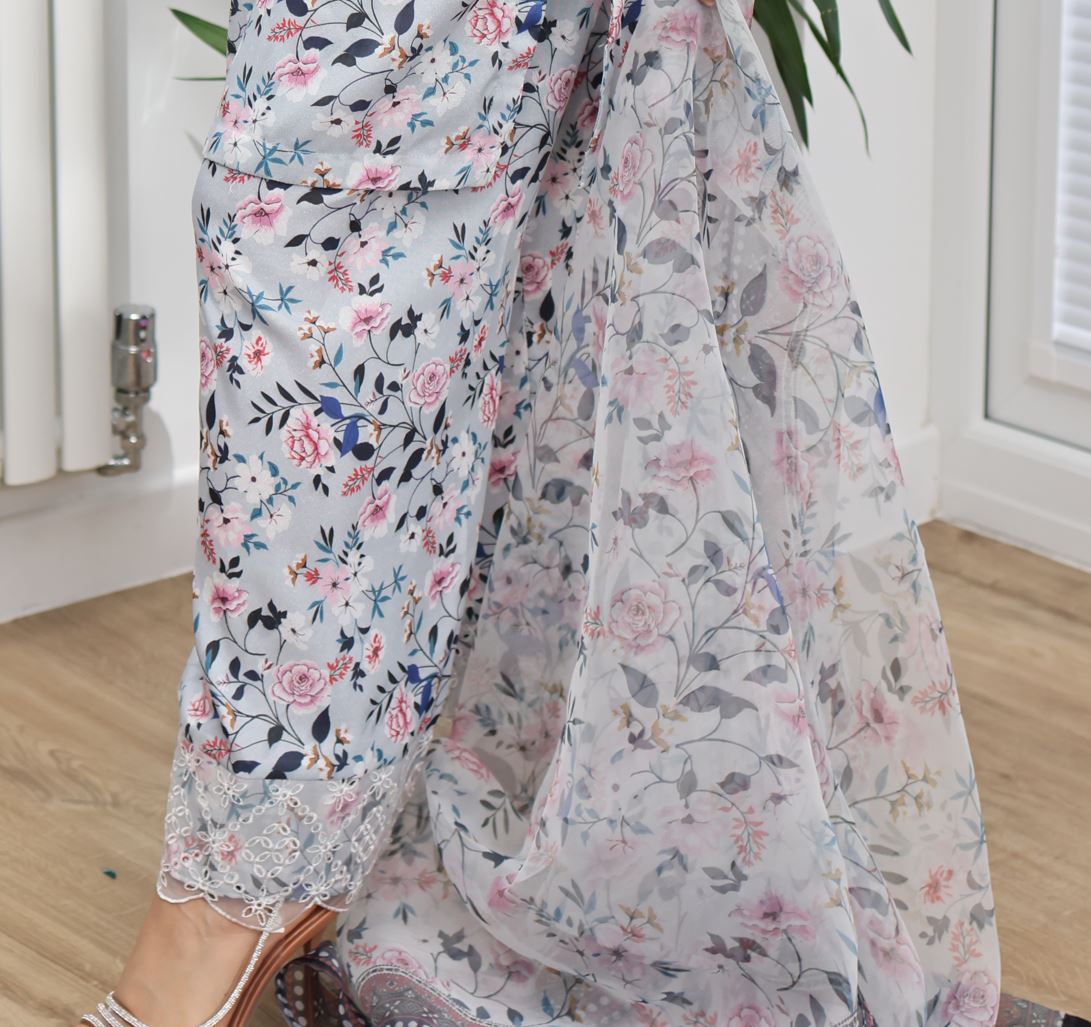 Grey Floral Printed 3pc Suit with Organza Dupatta