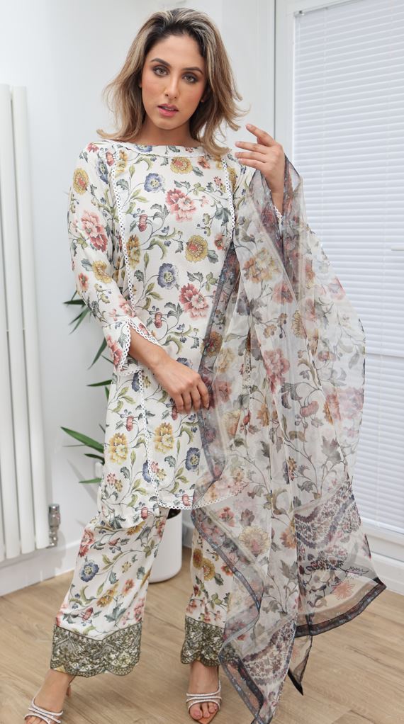 White Floral Printed 3pc Suit with Organza Dupatta