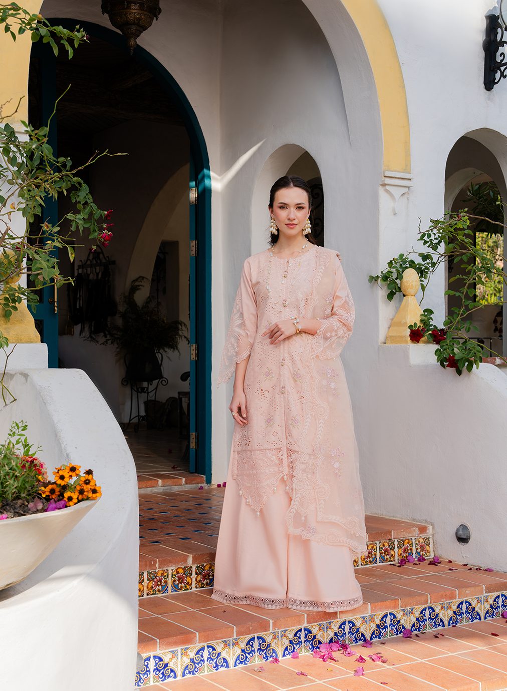 Dupatta: A tonal organza dupatta with floral embroidery throughout and scalloped borders, adding a light and graceful festive touch.