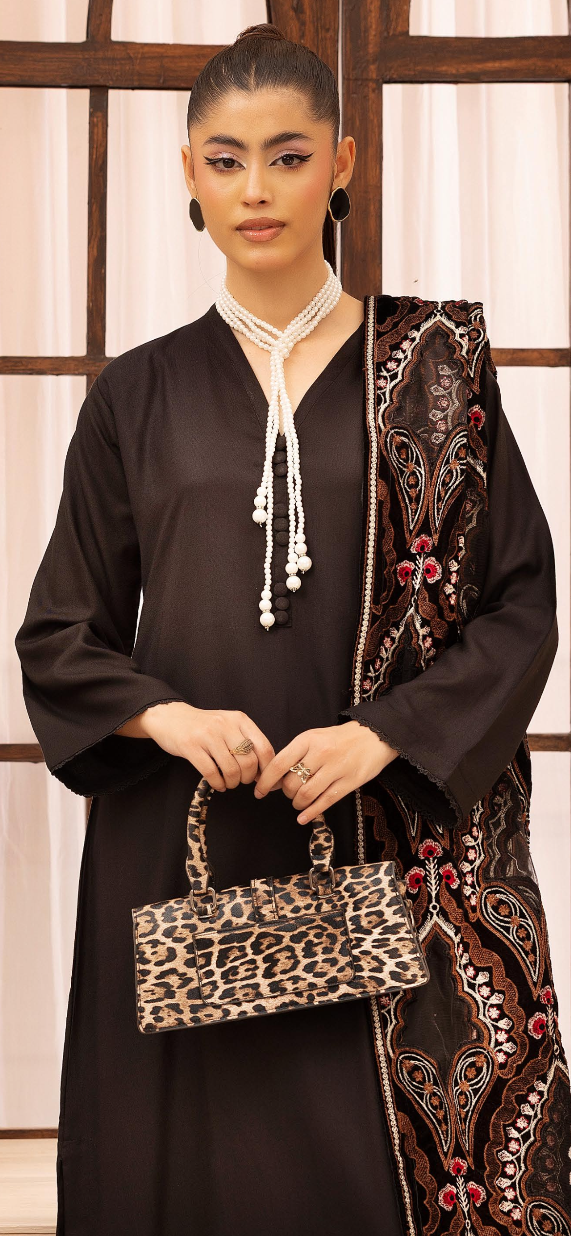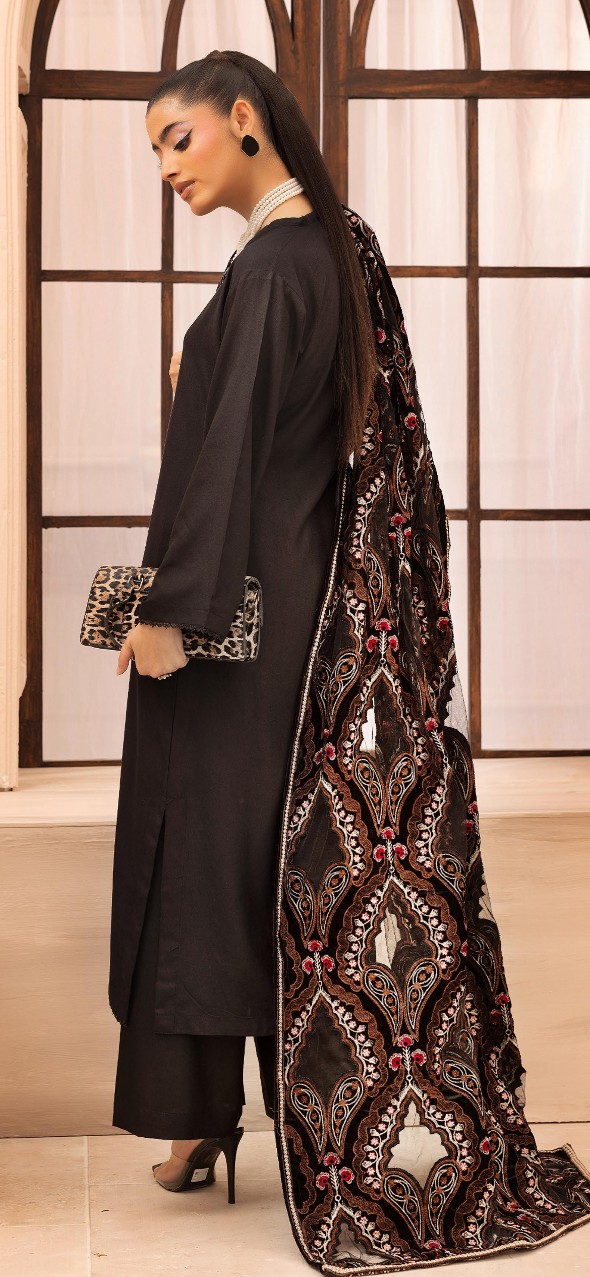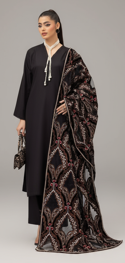 Black Dhanak 3pc Suit with Heavy Cutwork Shawl