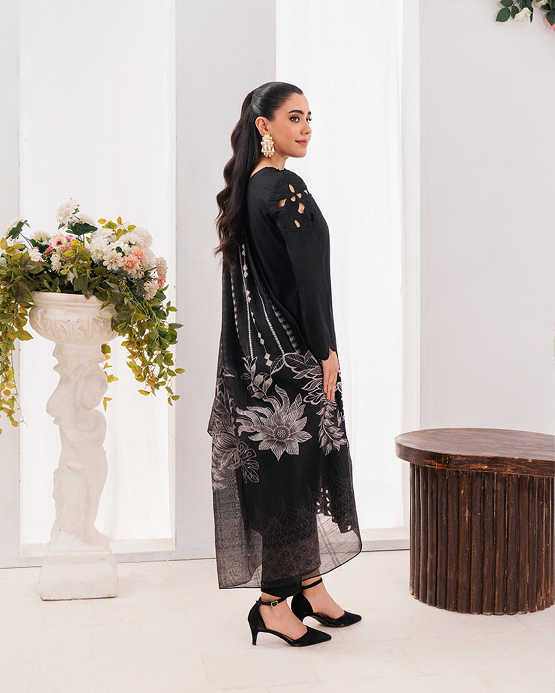 A matching monochrome printed dupatta with delicate floral motifs and structured borders. The lightweight fabric adds a graceful flow and completes the formal look.