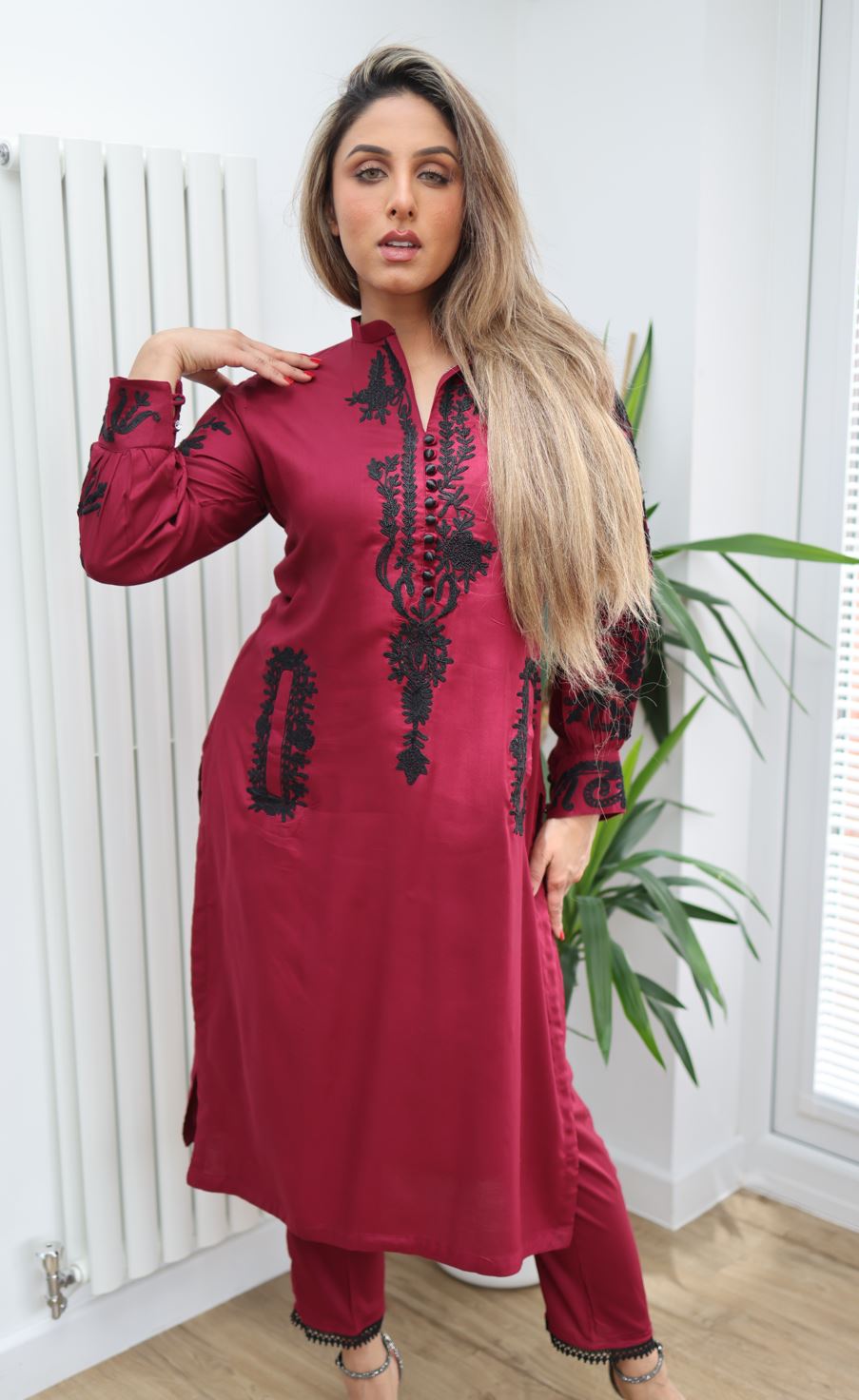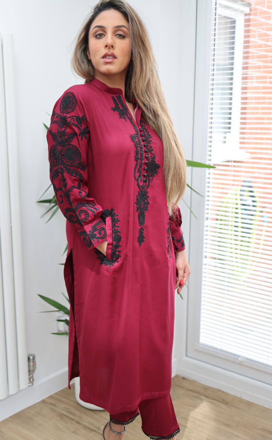 Kameez has a small collar and black thick thread embroidery on the sleeves which are finished a band cuff and buttons. Has pockets on each side of the kameez.