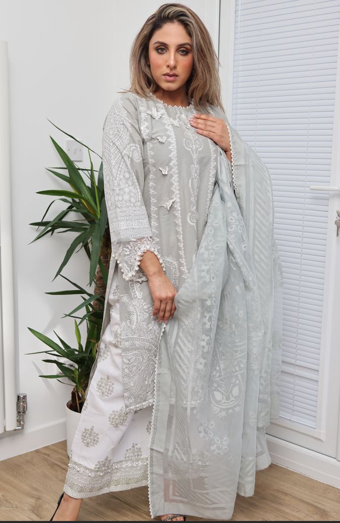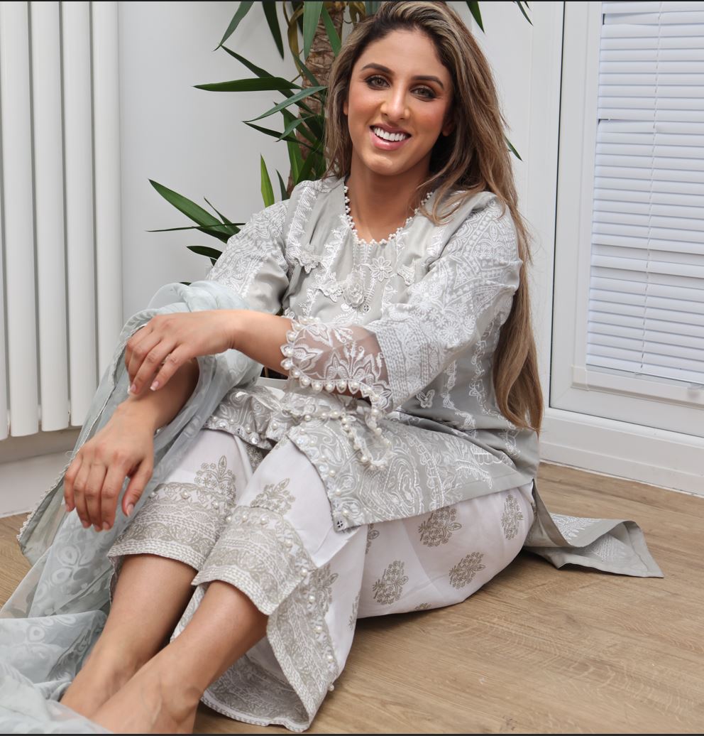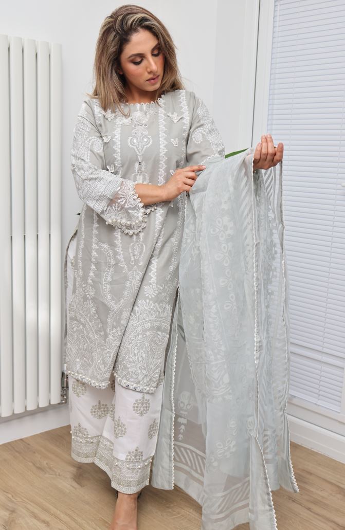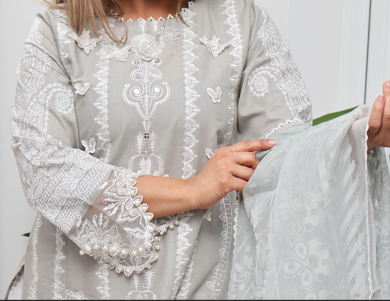 Grey 3pc Suit Kameez has white thread embroidery with 3D lace embellishments, neckline has pearl detailing and the sleeves are scalloped with a pearl trim to match the bottom of the kameez.