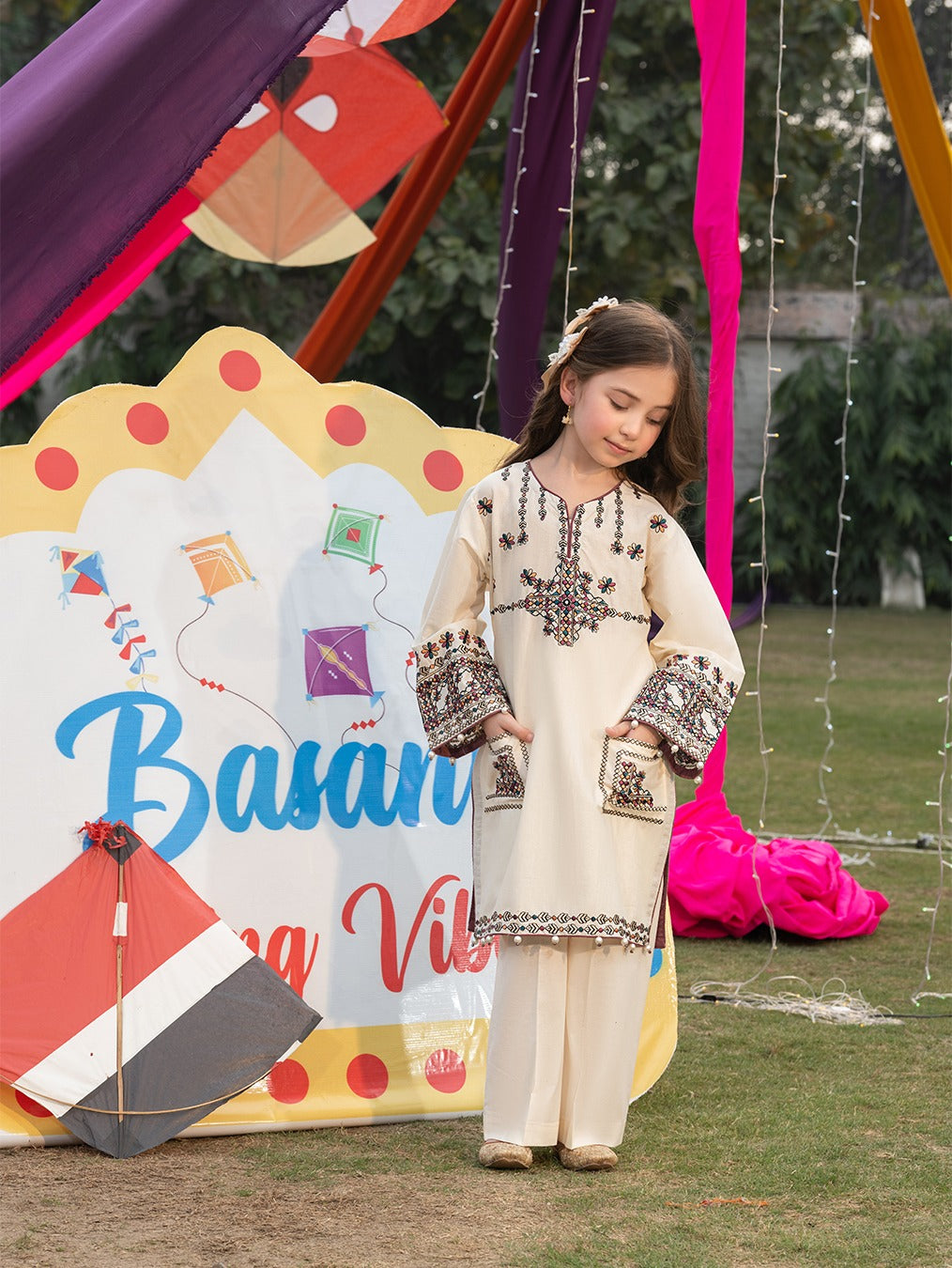 Shirt: A short white cotton kurta inspired by traditional folk art, with a split V-neckline, multi-colored geometric star embroidery in teal, ochre, and maroon, floral sprays, and a pearl-drop hem and cuffs.
