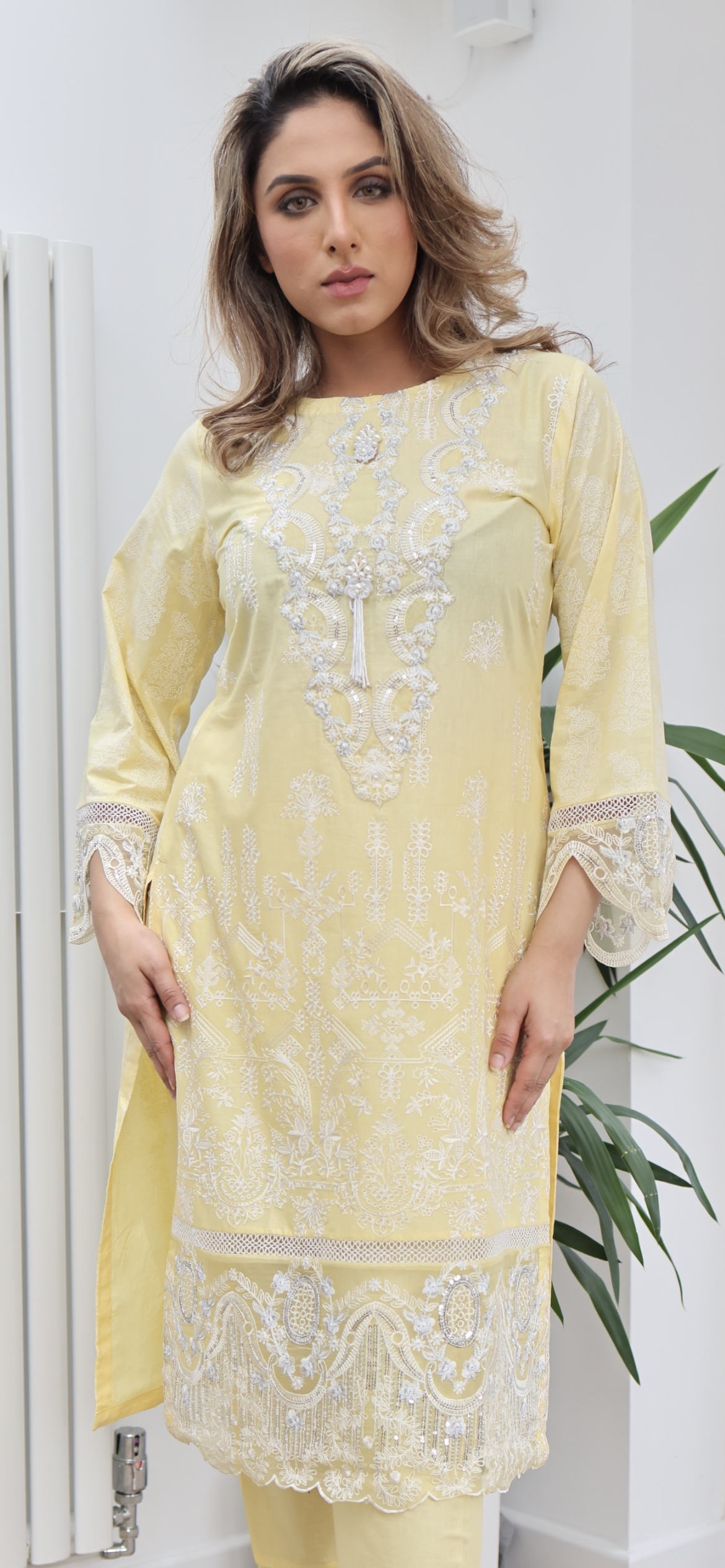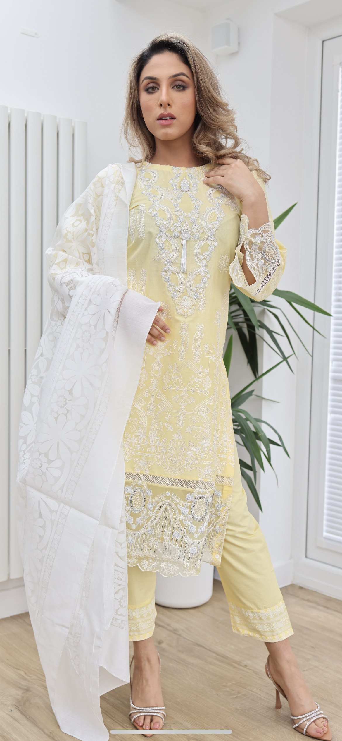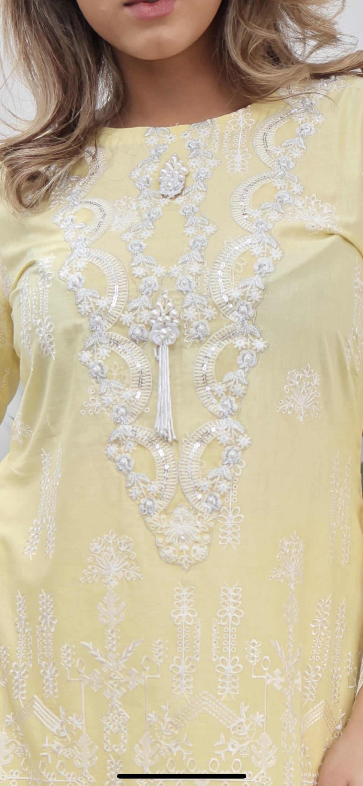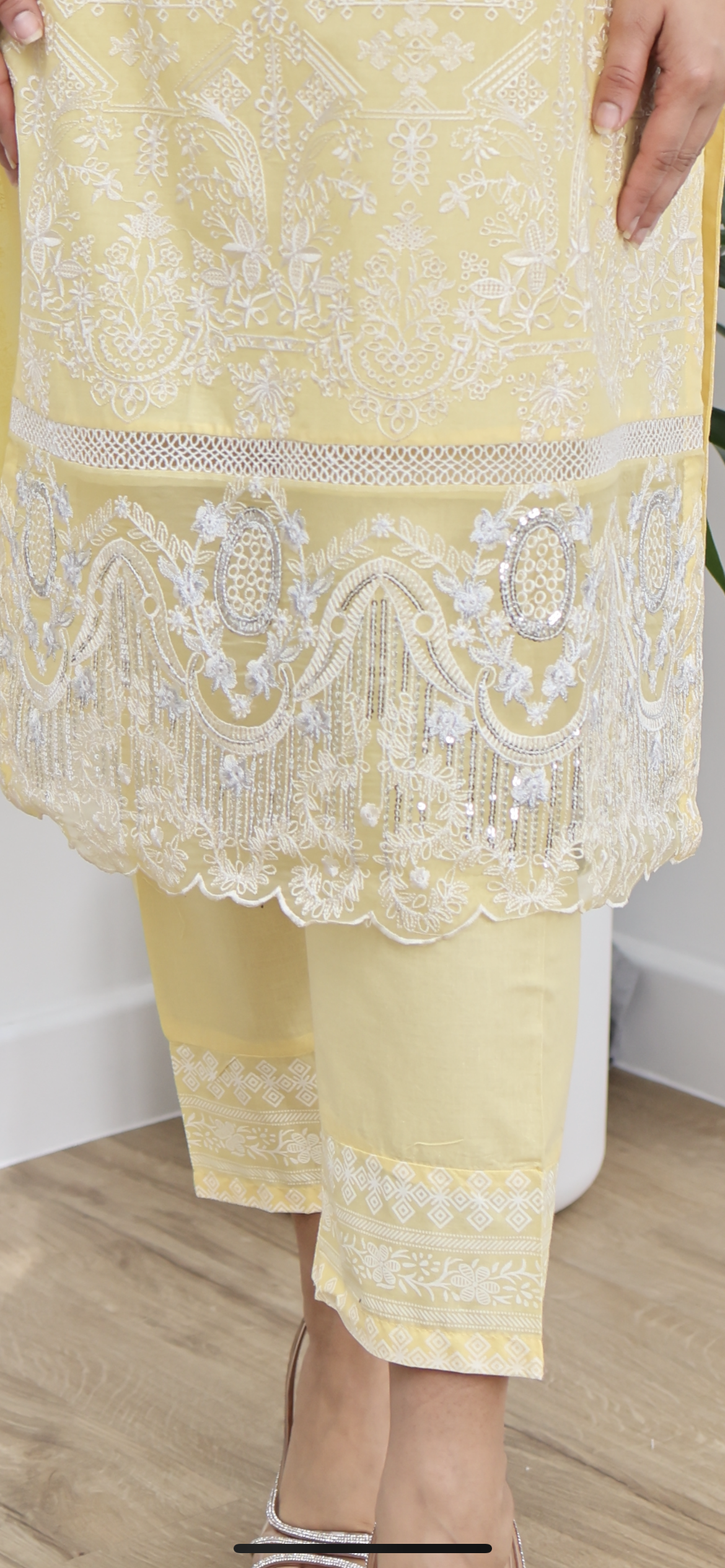 White thread embroidery with Pearl detailing and a organza border to the bottom of the kameez.