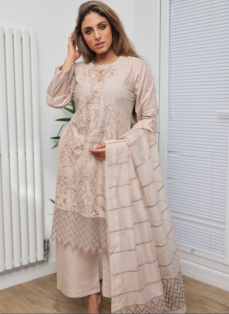 Mocha 3pc Lawn Suit, with Organza Chikankari Borders