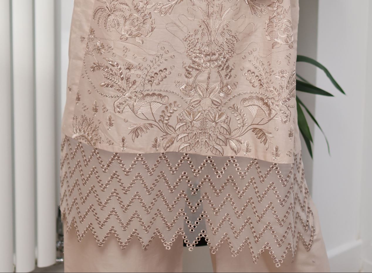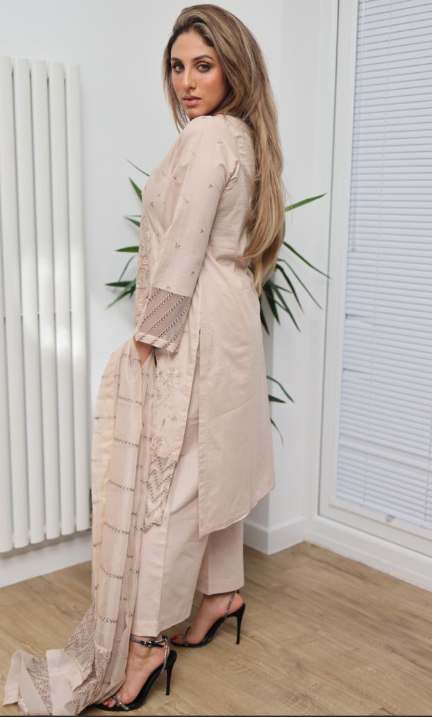 • Mocha 3pc Lawn suit. Kameez has Mocha threadwork and beaded peal detailing on and along the neckline. Organza chikankari sleeves and border on the kameez to match the Dupatta