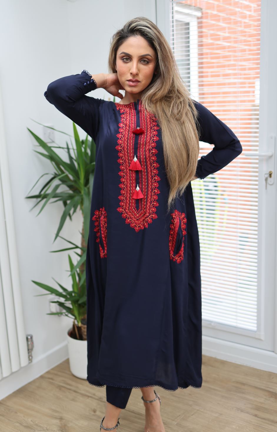 Blue Linen 2 pc Dress with Red and Orange Thread work embroidery it has pockets on each side of the dress and lace detailing on the sleeves