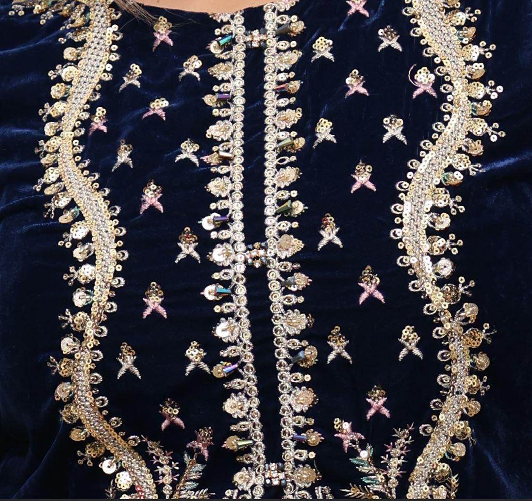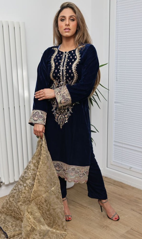 Navy 3pc Velvet Suit with Organza Dupatta