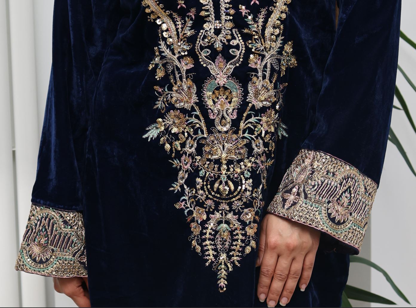 3pc Cotail Velvet suit Kameez has gold thread detailing on the neckline, arms and border. Touches of baby blue and pink threadwork incorporated within the gold