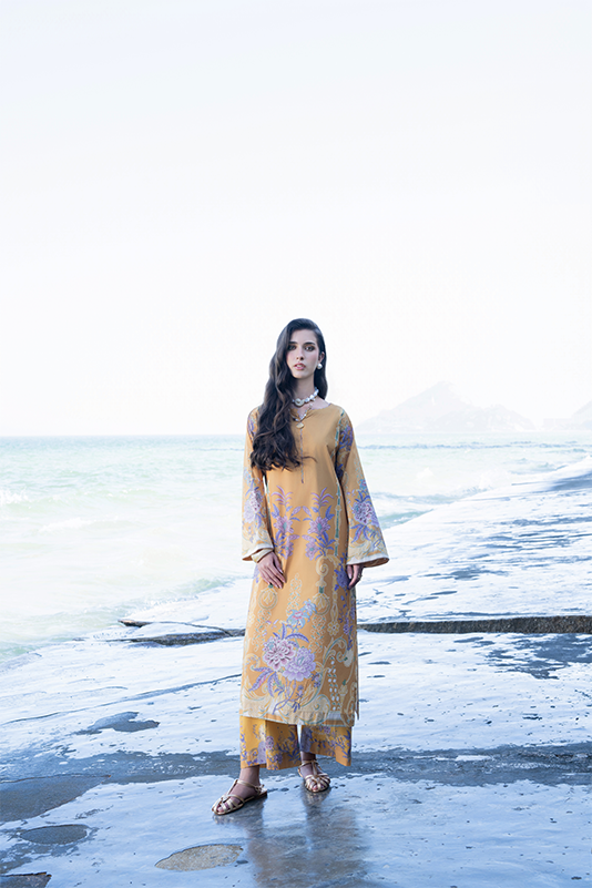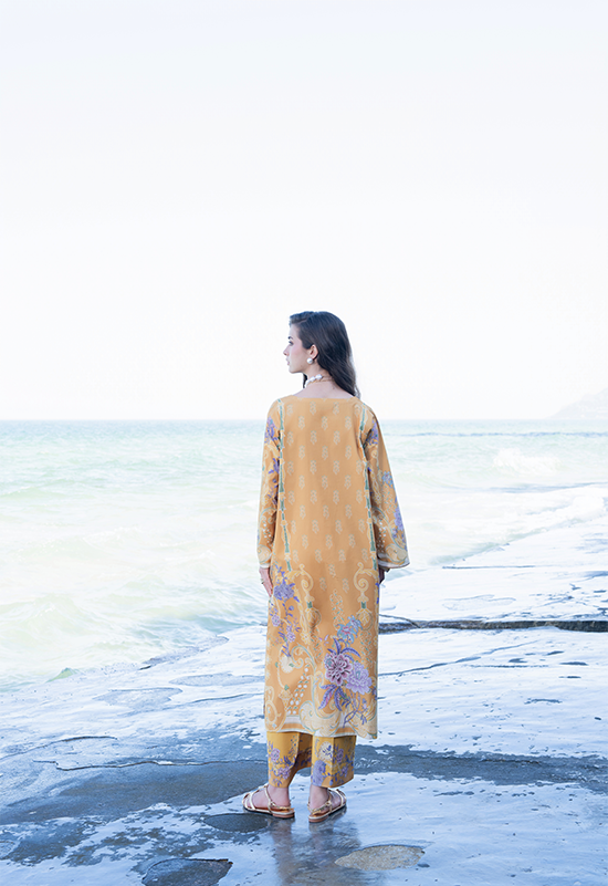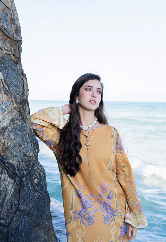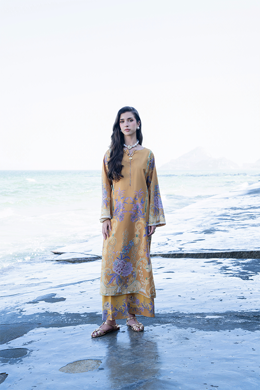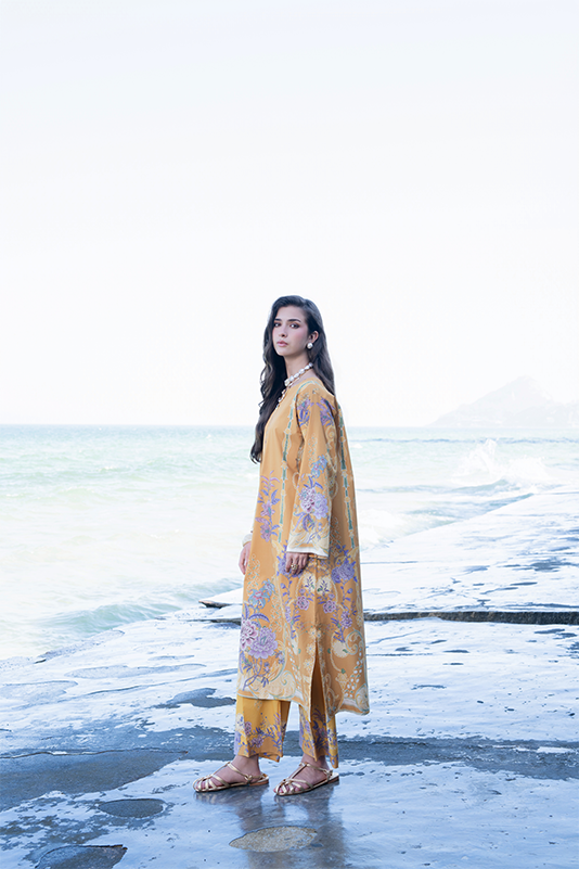 Shirt: A mustard-gold silk kurta with a boat neckline and central slit, featuring delicate self-print and lilac floral digital motifs accented with teal architectural and ivory scrolling patterns along the hem and sleeves.