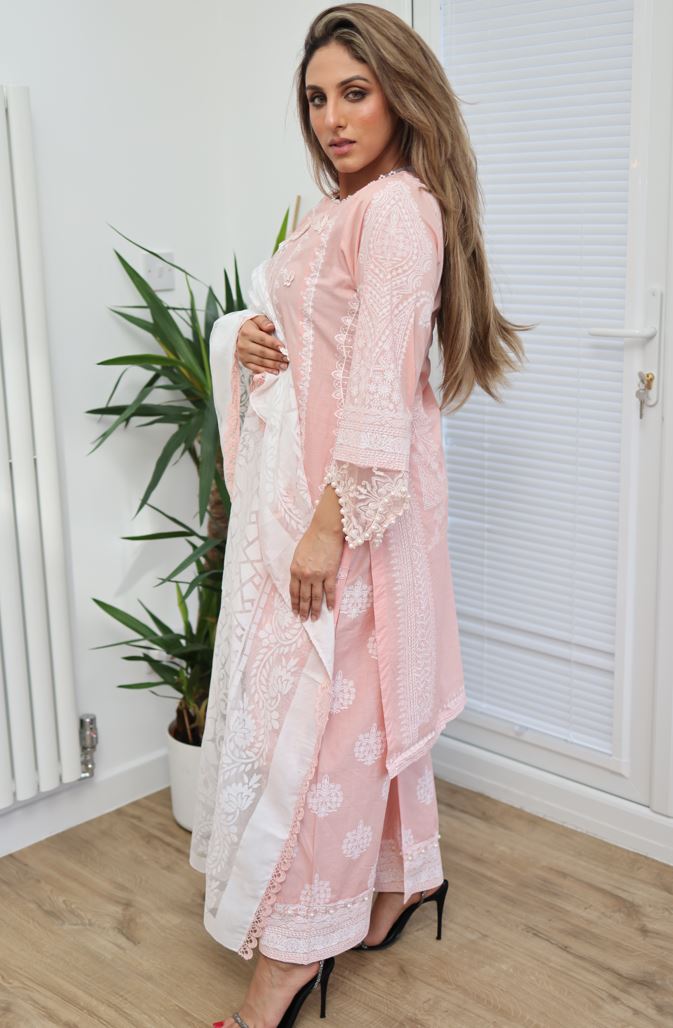 Peach 3pc Suit Kameez has white thread embroidery with 3D lace embellishments, neckline has pearl detailing and the sleeves are scalloped with a pearl trim to match the bottom of the kameez.