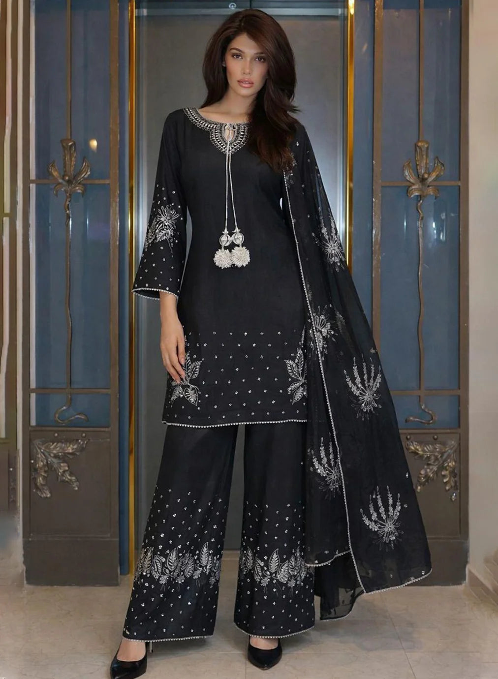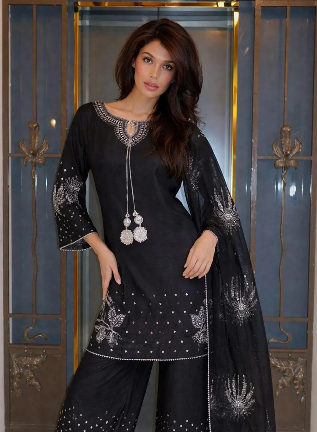 Shirt: A jet-black lawn shirt with an intricately embroidered silver neckline, keyhole detail, and statement tassels, finished with floral embroidery, scattered motifs, and fine beaded lace.