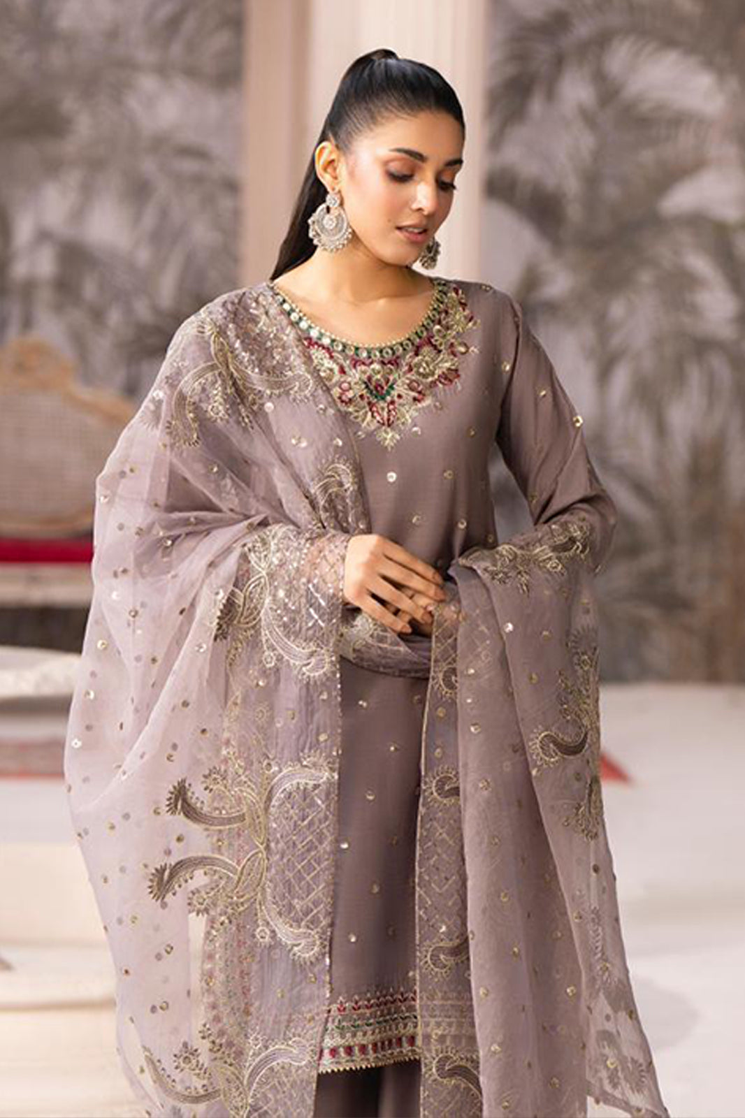 Dupatta: Matching pink organza dupatta with gold-tilla floral borders and scattered sequins.