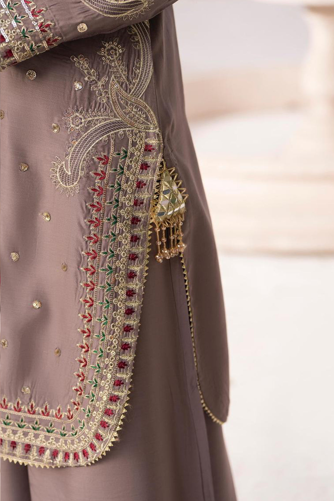 Shirt: A soft pink viscose shirt with a straight-cut silhouette, rounded neckline, multi-colored embroidered gallah, scattered sequins, and intricately embroidered hem and sleeve cuffs with curved side slits.