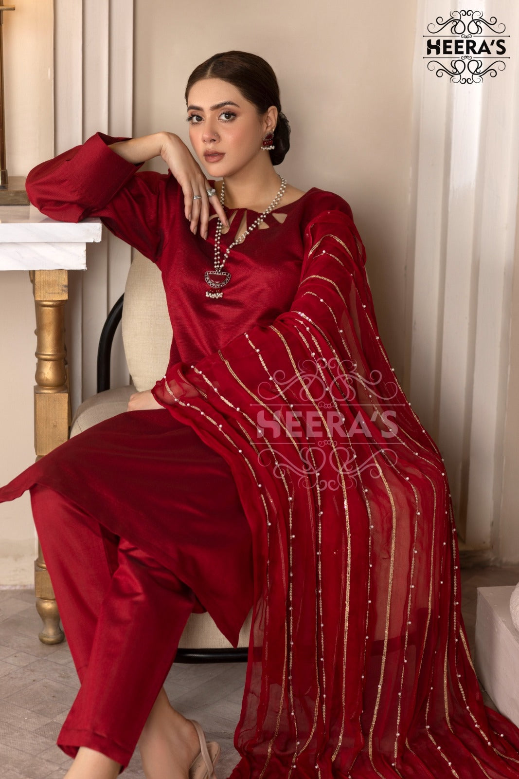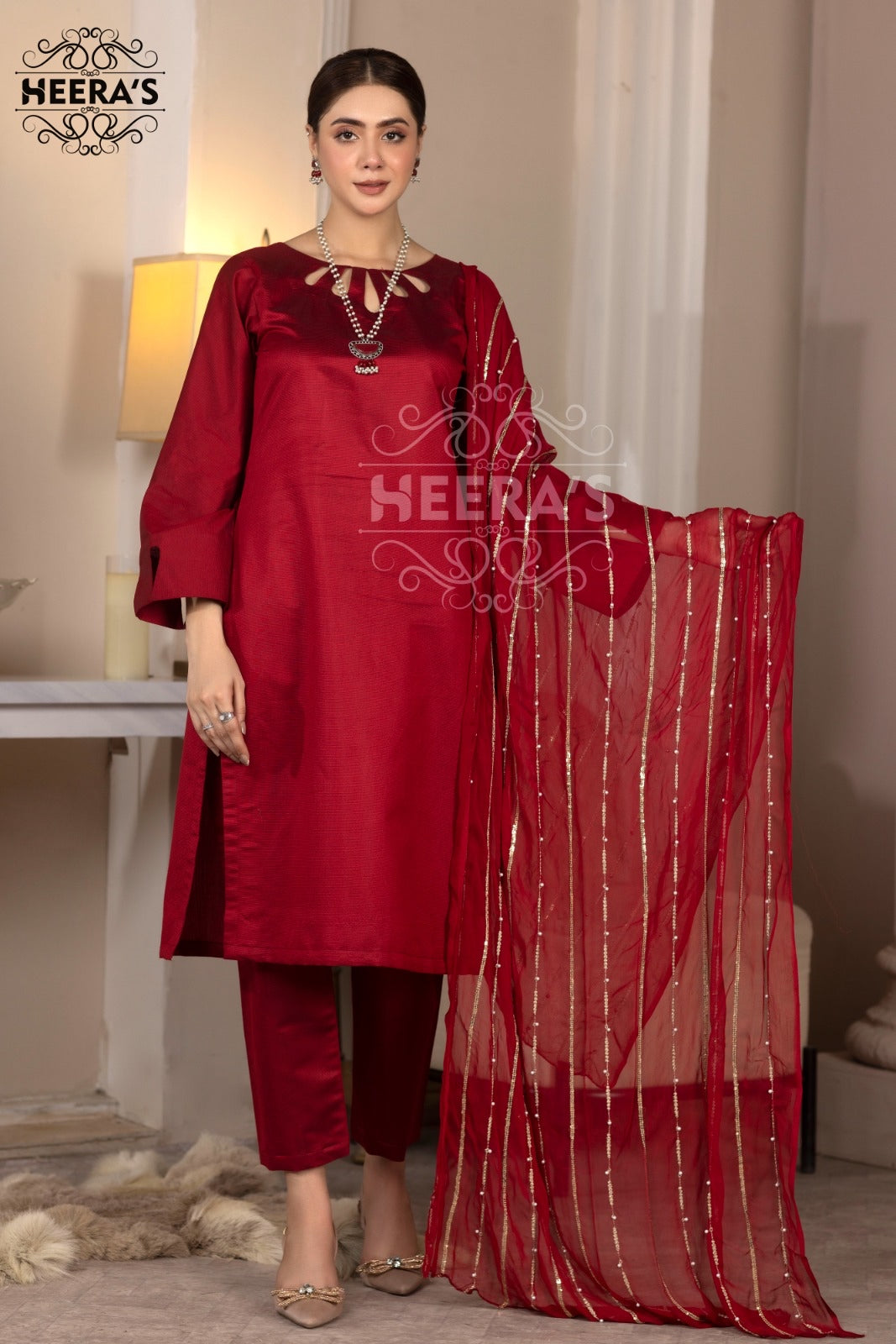 Red 3pc Viscose suit with Statement Dupatta