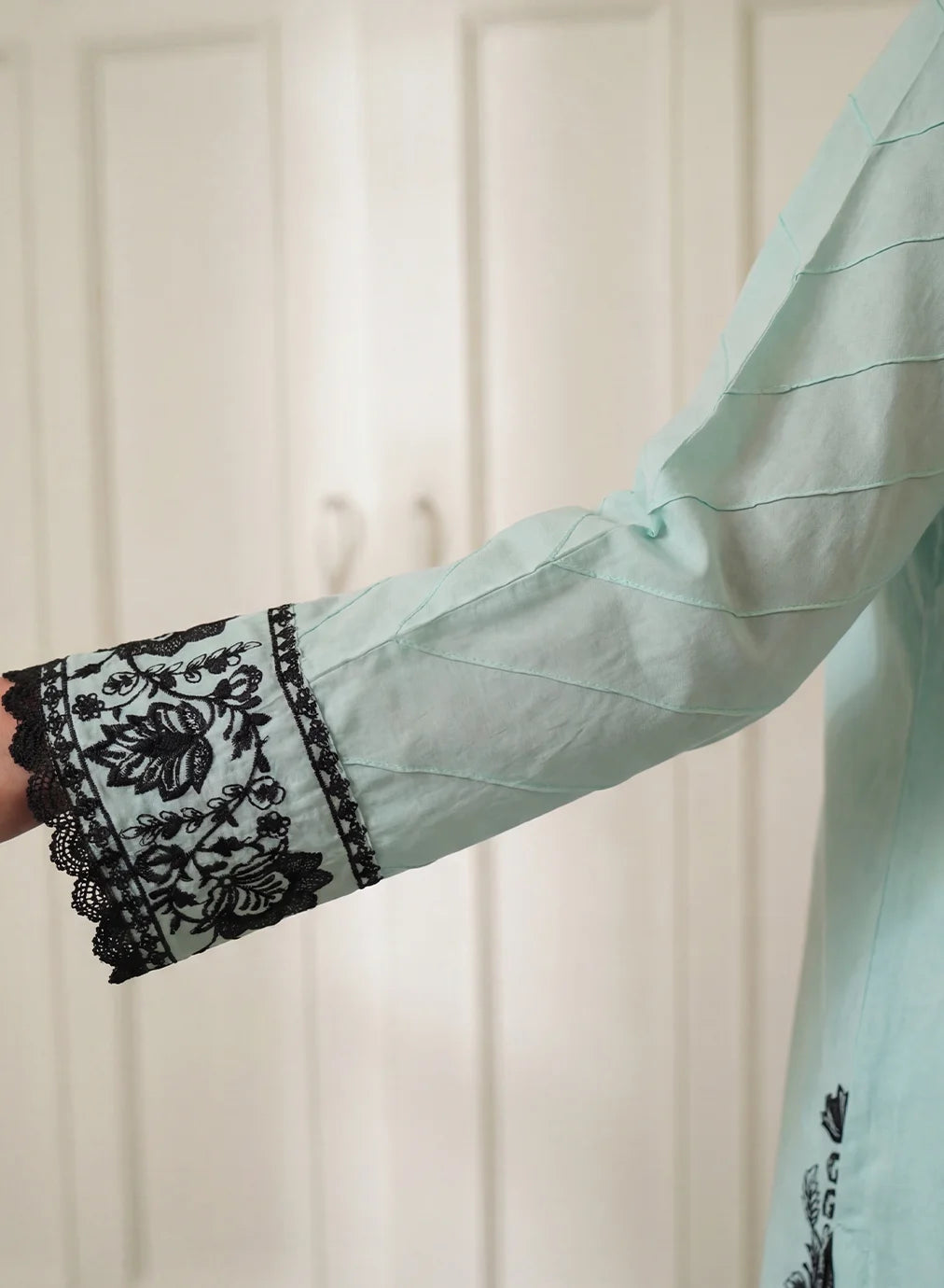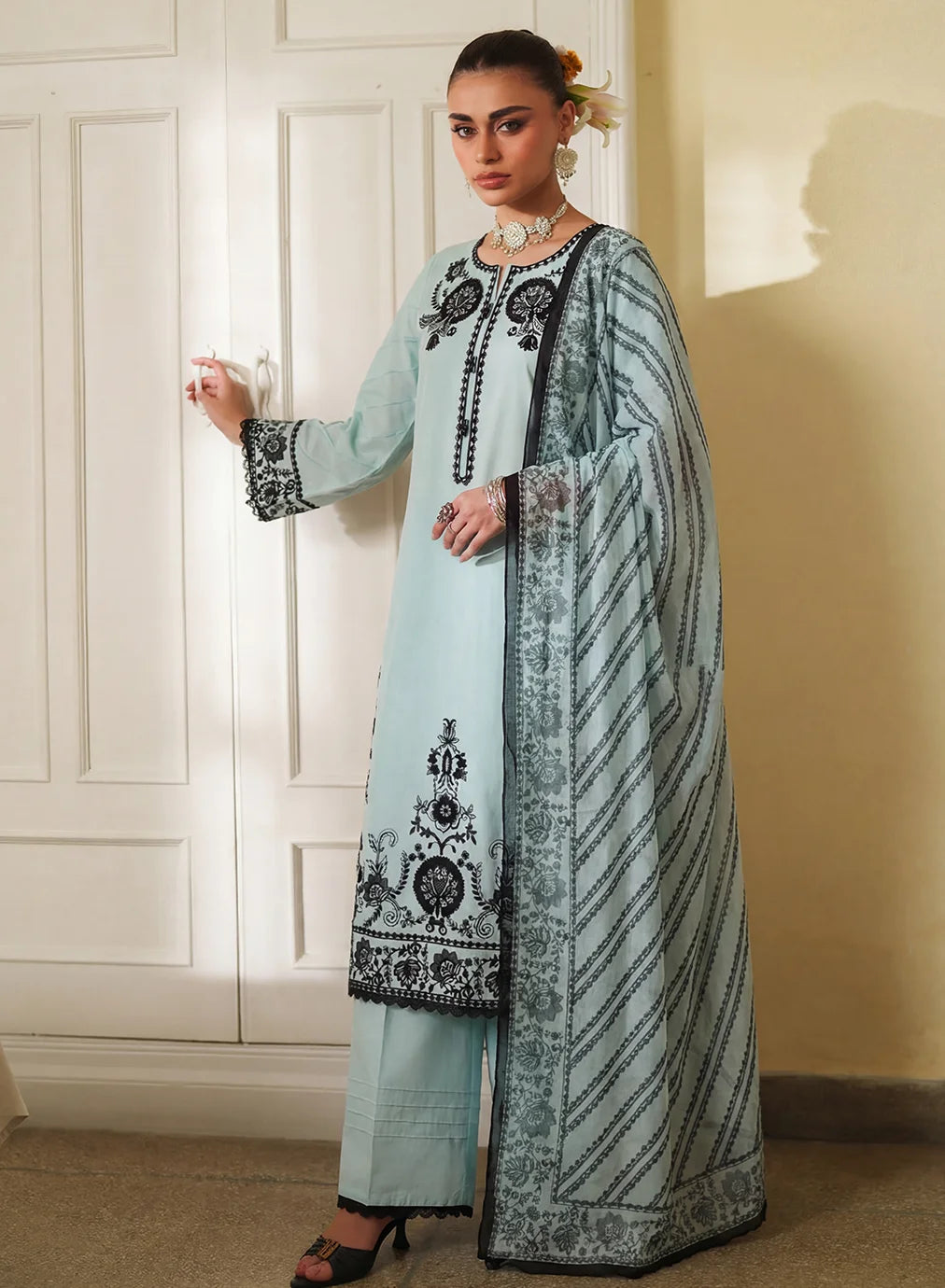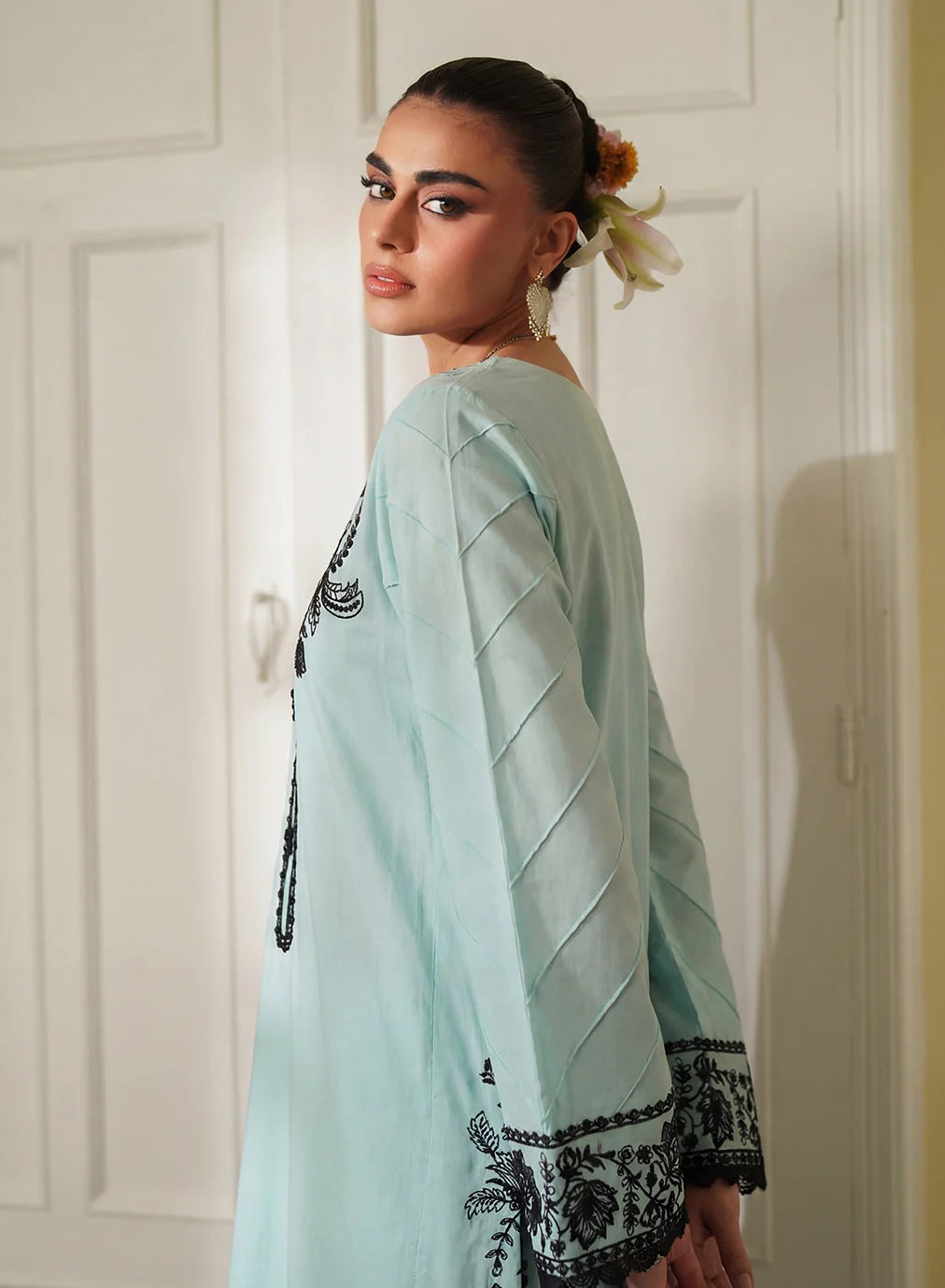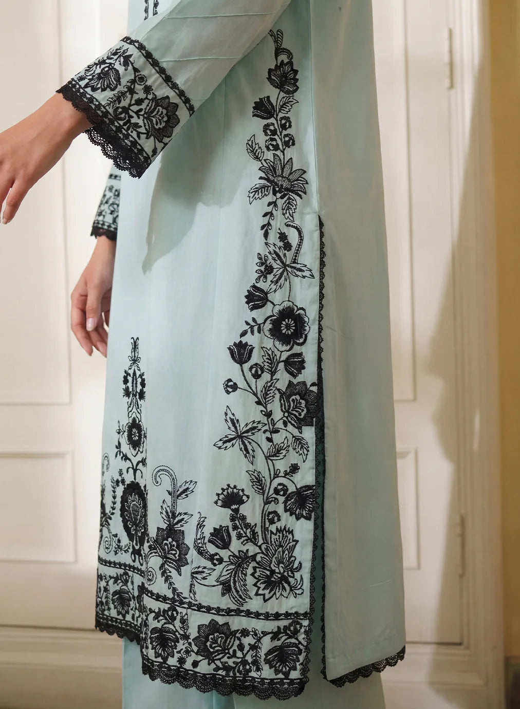Shirt: Ice-blue straight lawn shirt with deep black floral embroidery, button-loop placket, and wide embroidered hem.