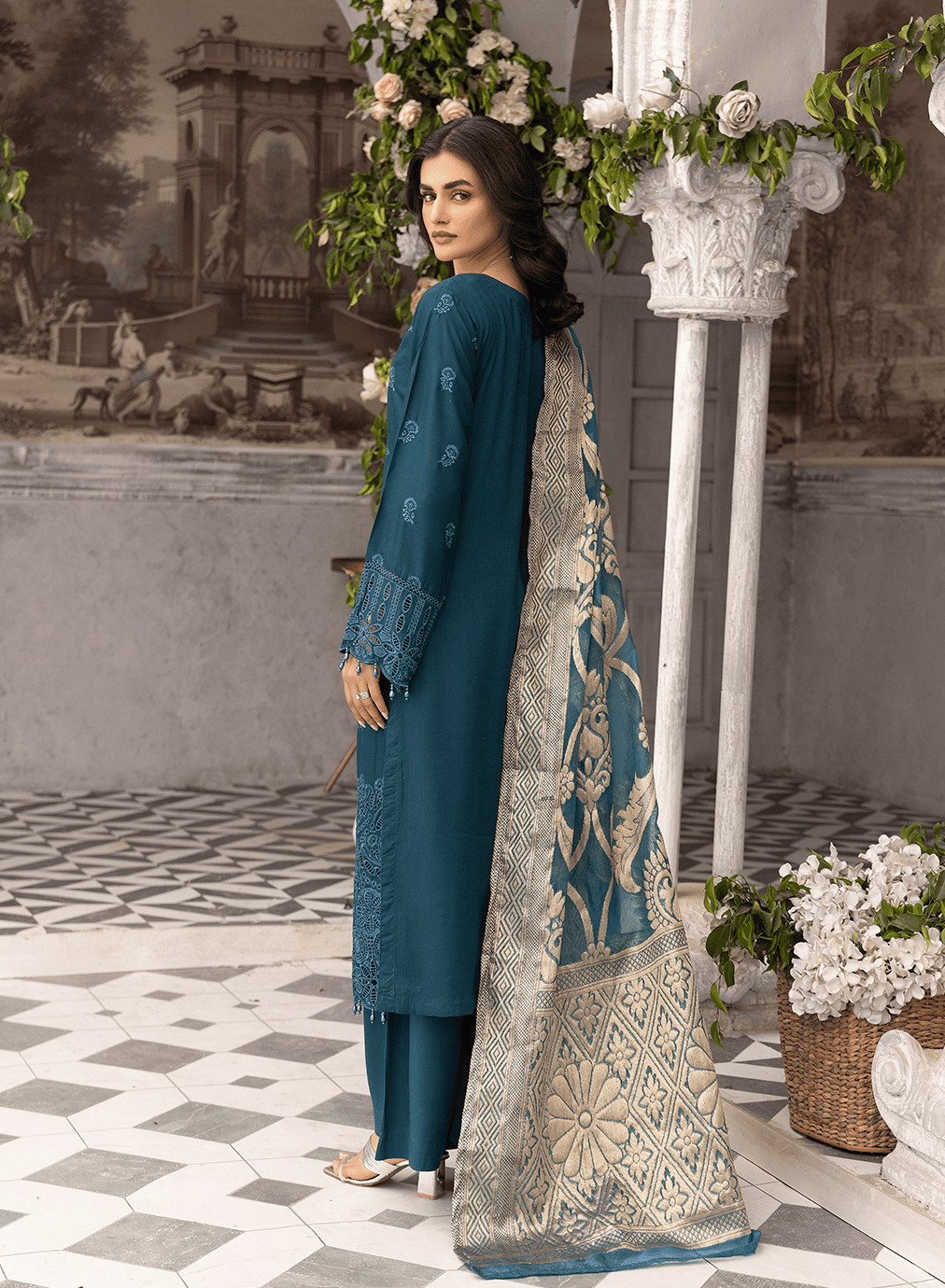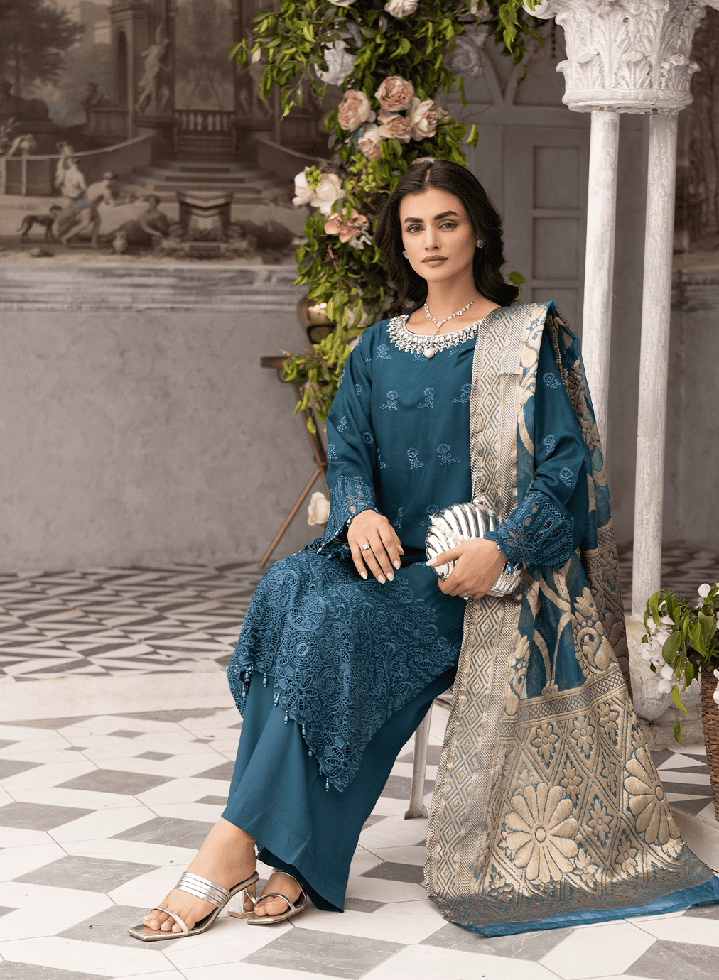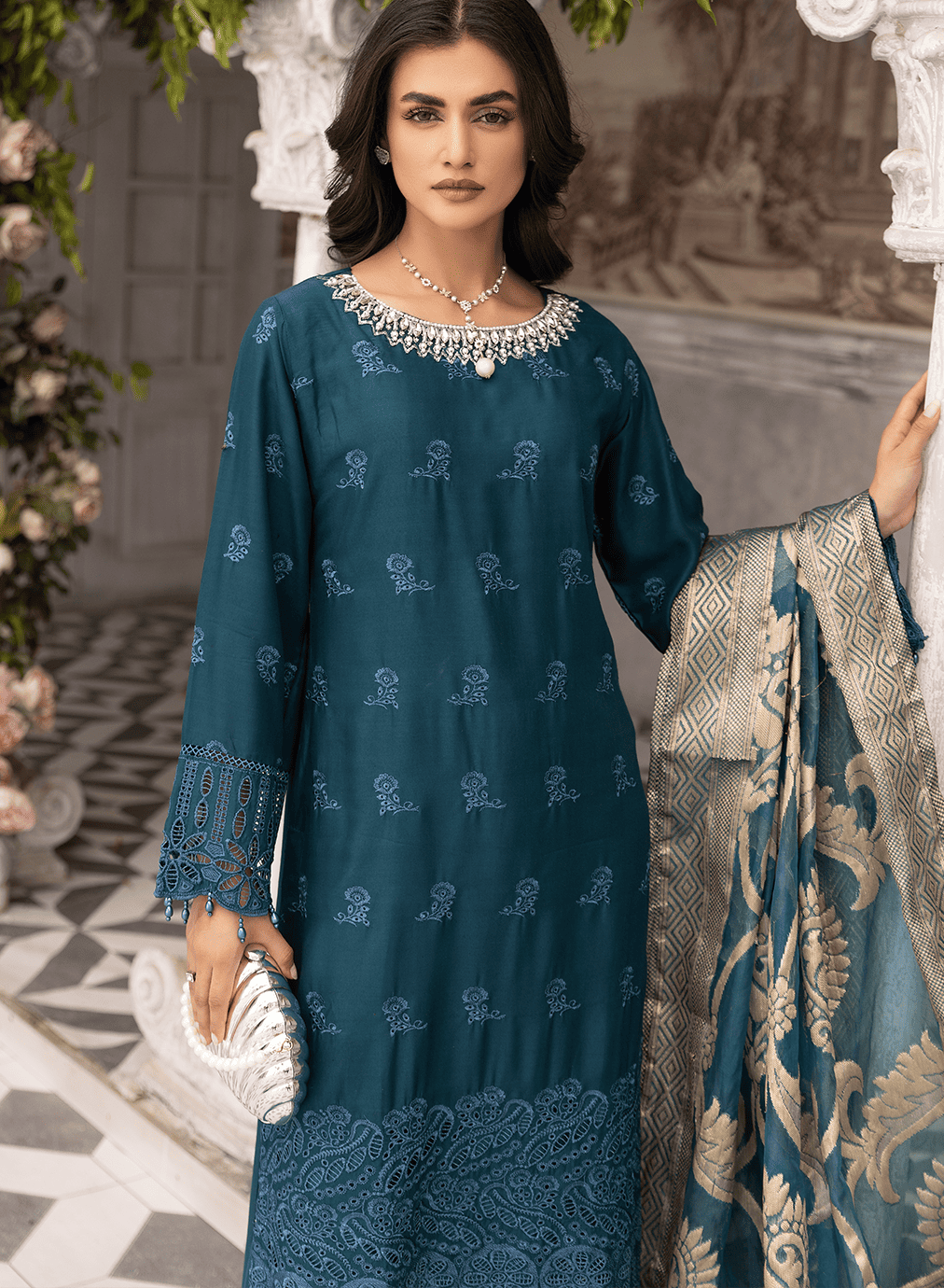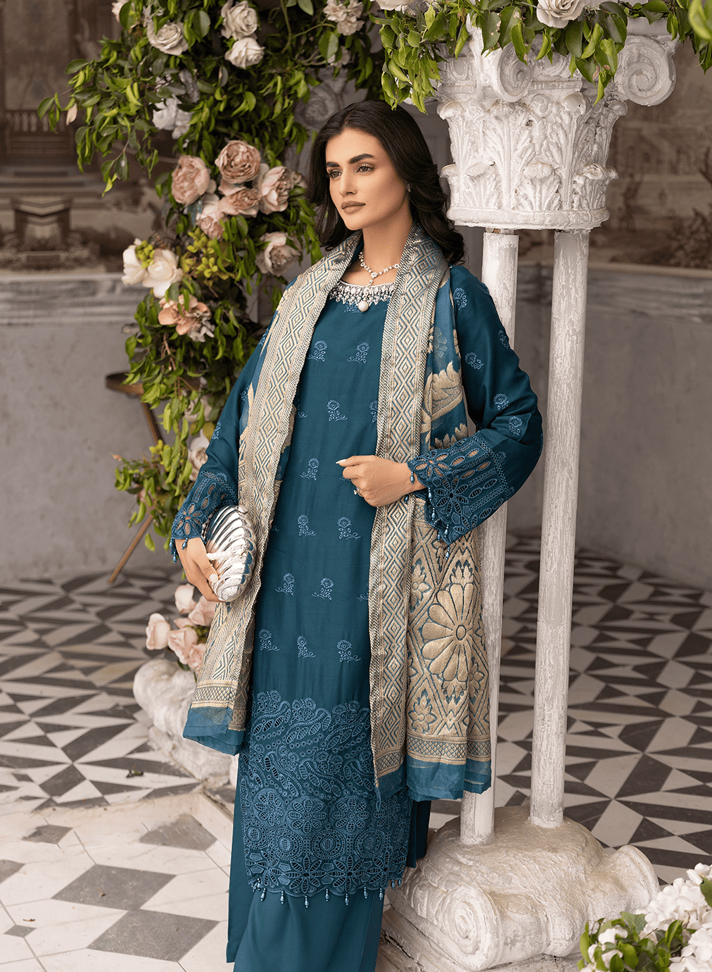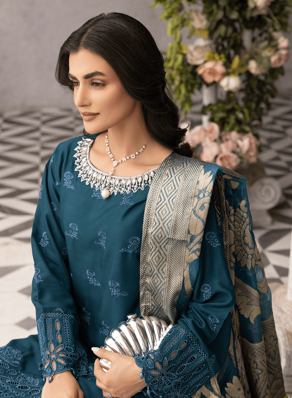 Dupatta: Completed with a premium Jacquard dupatta featuring a self-woven tonal pattern that adds subtle shimmer and sophistication to the ensemble.